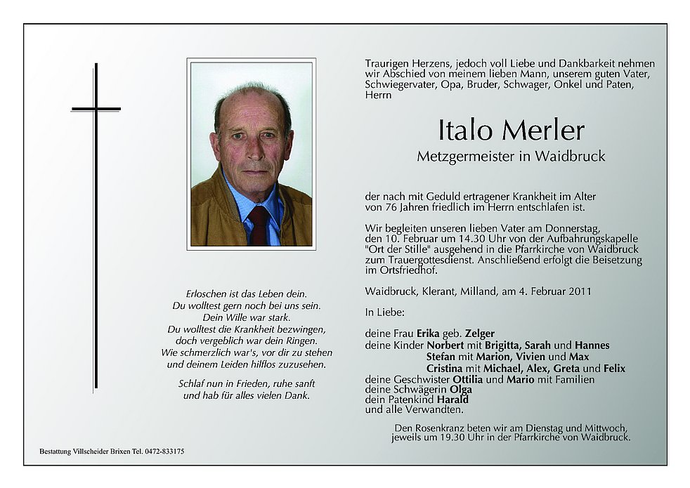 den 10. Februar um 14.30 Uhr von der Aufbahrungskapelle "Ort der Stille" ausgehend in die Pfarrkirche von Waidbruck zum Trauergottesdienst. Anschließend erfolgt die Beisetzung