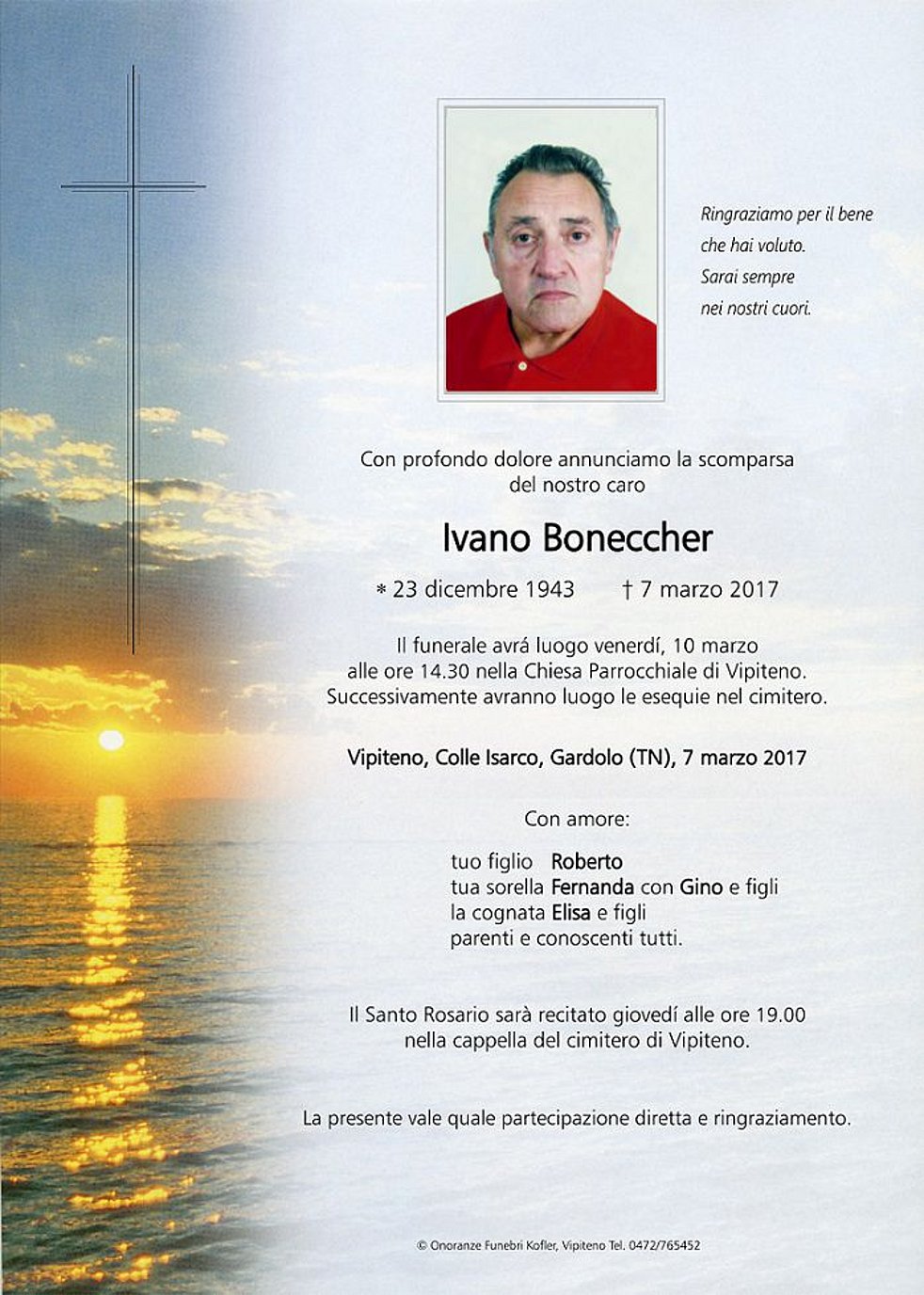 Il funerale avrá luogo venerdí, 10 marzo alle ore 14.30 nella Chiesa Parrocchiale di Vipiteno. Successivamente avranno luogo le esequie nel cimitero.