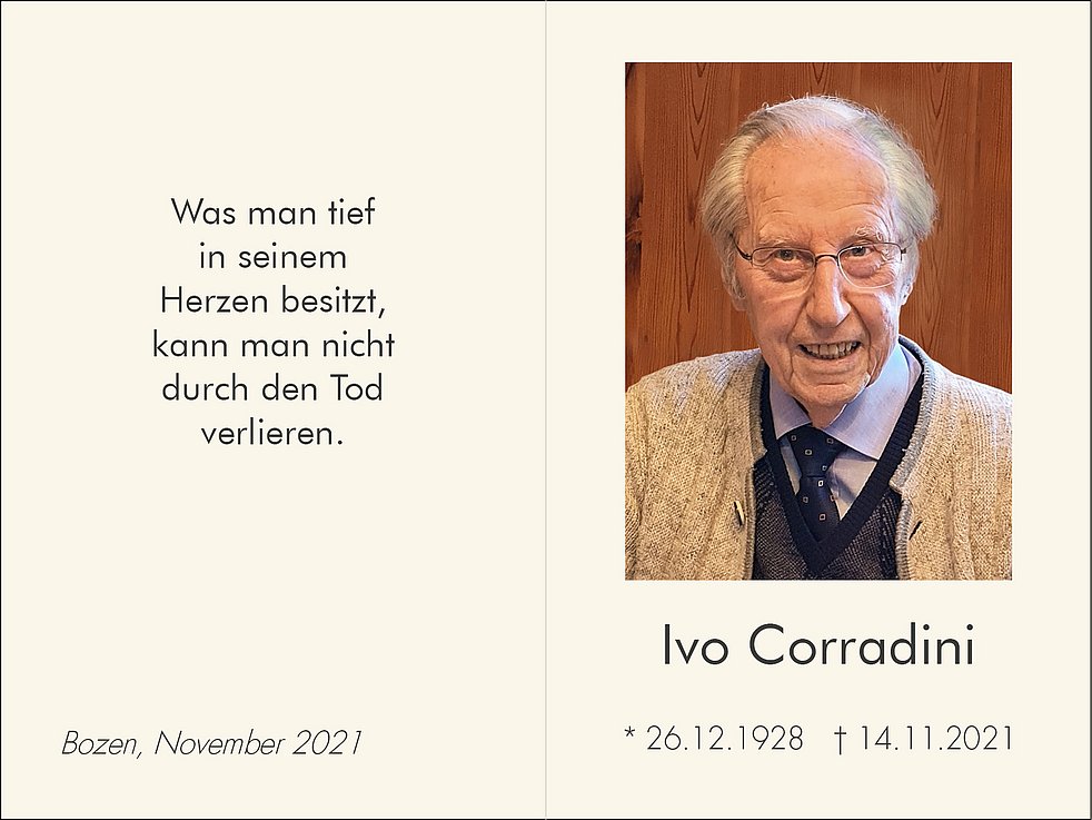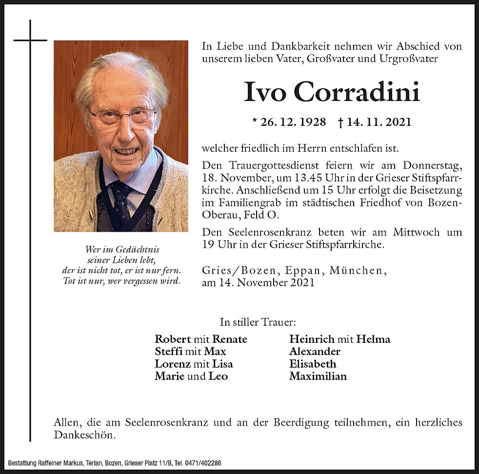 Den Trauergottesdienst feiern wir am Donnerstag, 18. November, um 13.45 Uhr in der Grieser Stiftspfarrkirche. Anschließend um 15 Uhr erfolgt die Beisetzung im Familiengrab im städtischen Friedhof von Bozen-Oberau, Feld O.