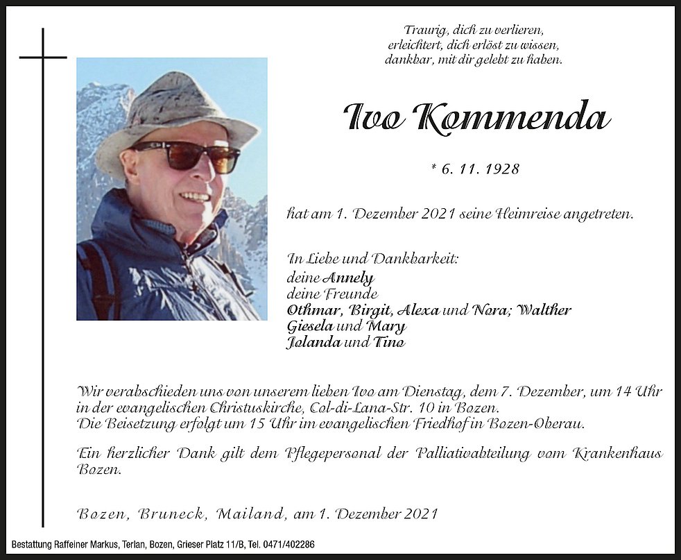 Wir verabschieden uns von unserem lieben Ivo am Dienstag, dem 7. Dezember, um 14 Uhr in der evangelischen Christuskirche, Col di Lana Str. 10 in Bozen.