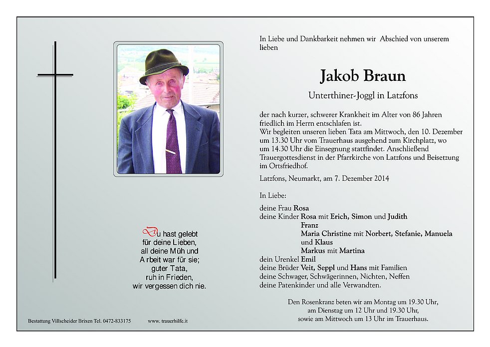 um 14.30 Uhr die Einsegnung stattfindet. Anschließend Trauergottesdienst in der Pfarrkirche von Latzfons und Beisetzung