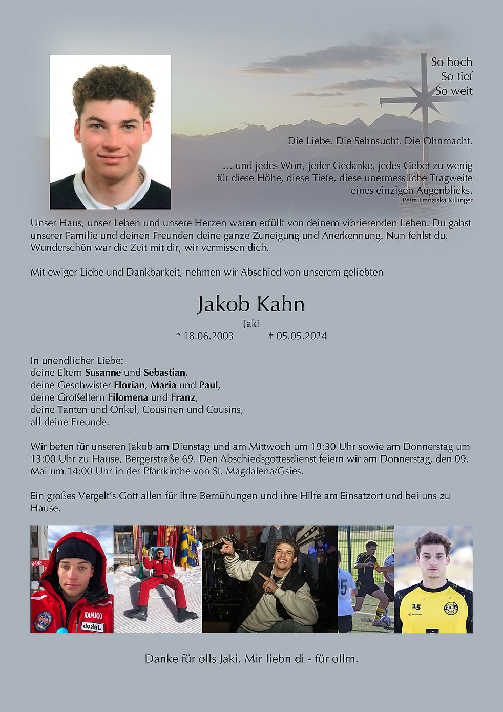 Liebe Susi, liebe Trauerfamilie, es tut mir so unendlich leid. Tiefe Anteilnahme an Eurem so großen Schmerz und viel Kraft in dieser so dunklen Zeit. Jakob ruhe sanft in Gottes Hand. Michela Eppacher