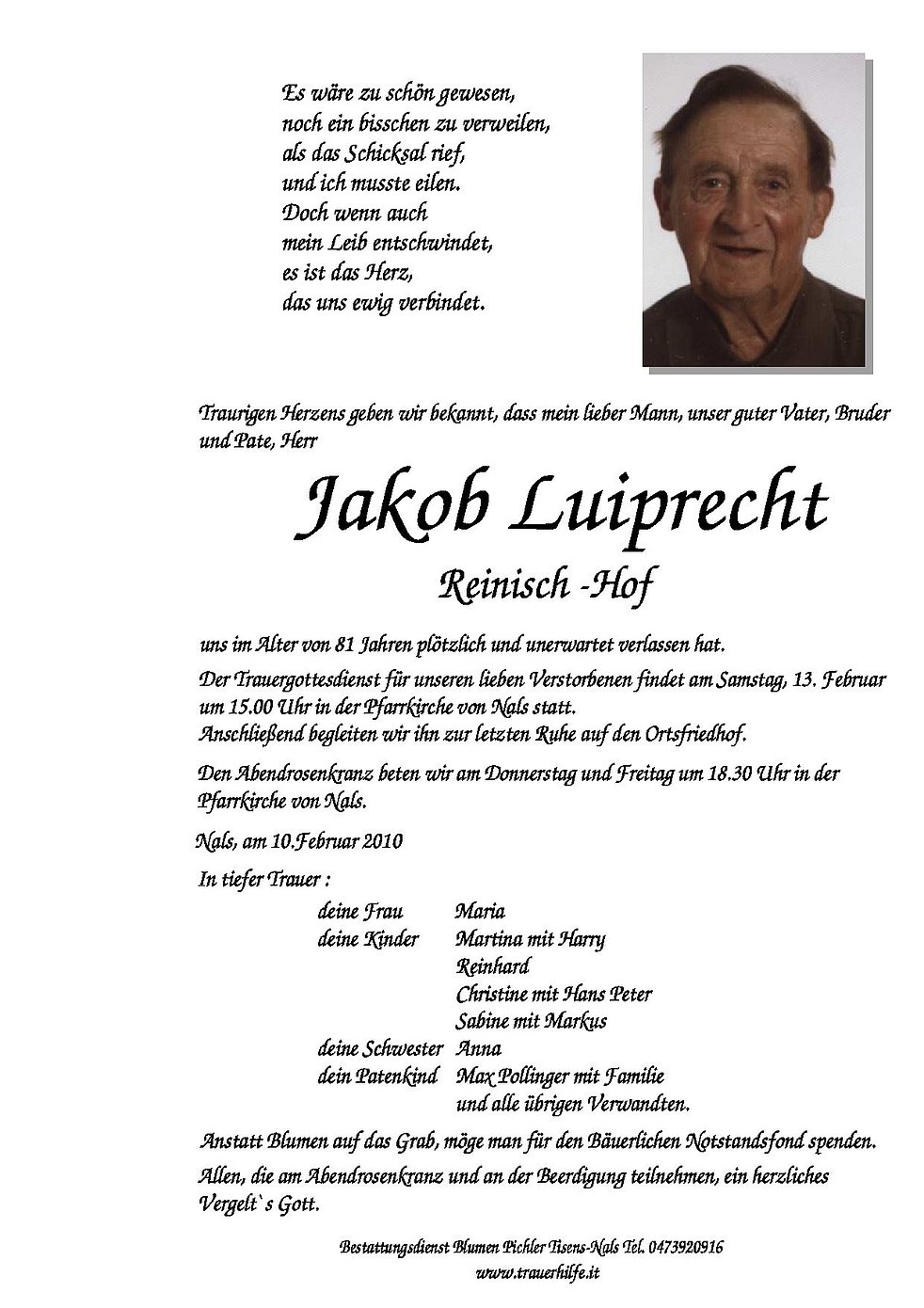 Anstatt Blumen auf das Grab, möge man für den Bäuerlichen Notstandsfond spenden.