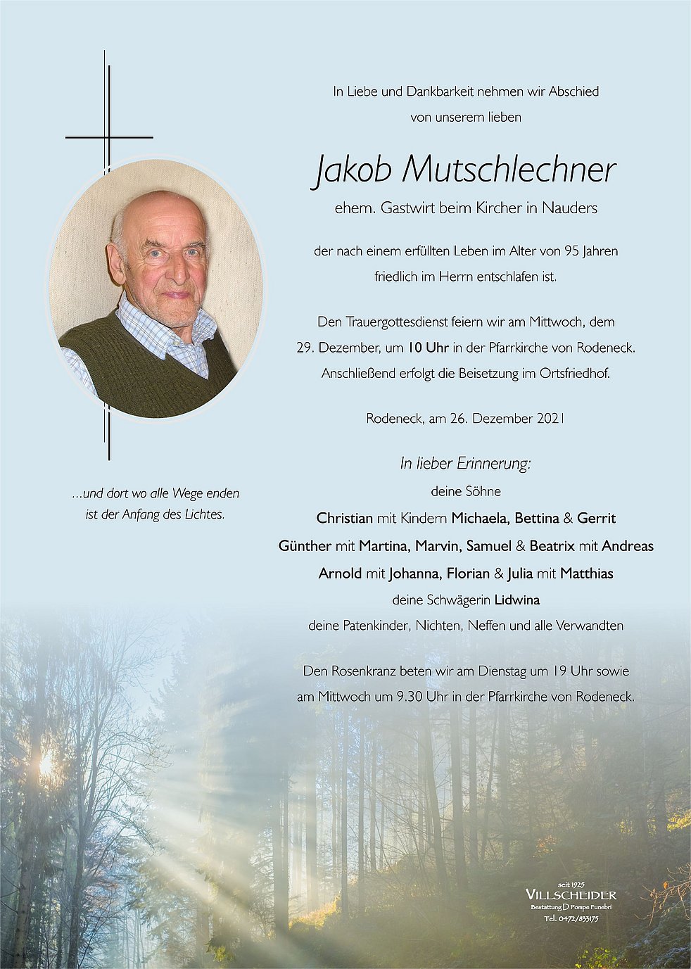 Begräbnisgottesdienst: 29.12. - 10:00 Uhr Rodeneck