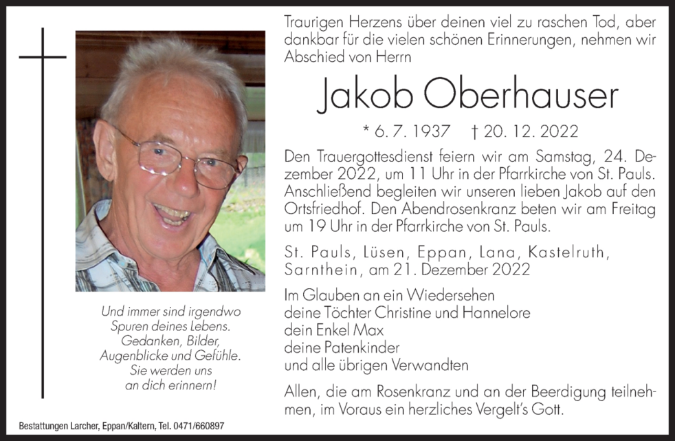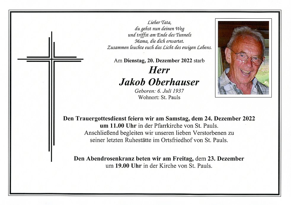 Den Trauergottesdienst feiern wir am Samstag, 24. Dezember 2022 um 11 Uhr in der Pfarrkirche von St. Pauls. Anschließend begleiten wir unseren lieben Jakob auf den Ortsfriedhof.