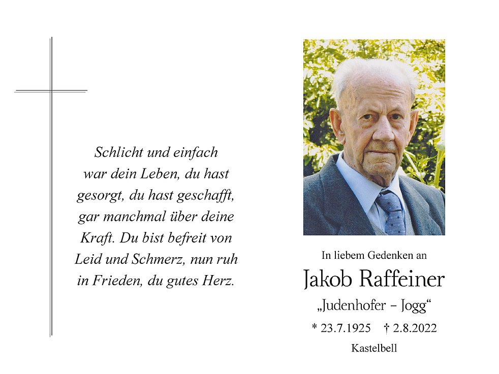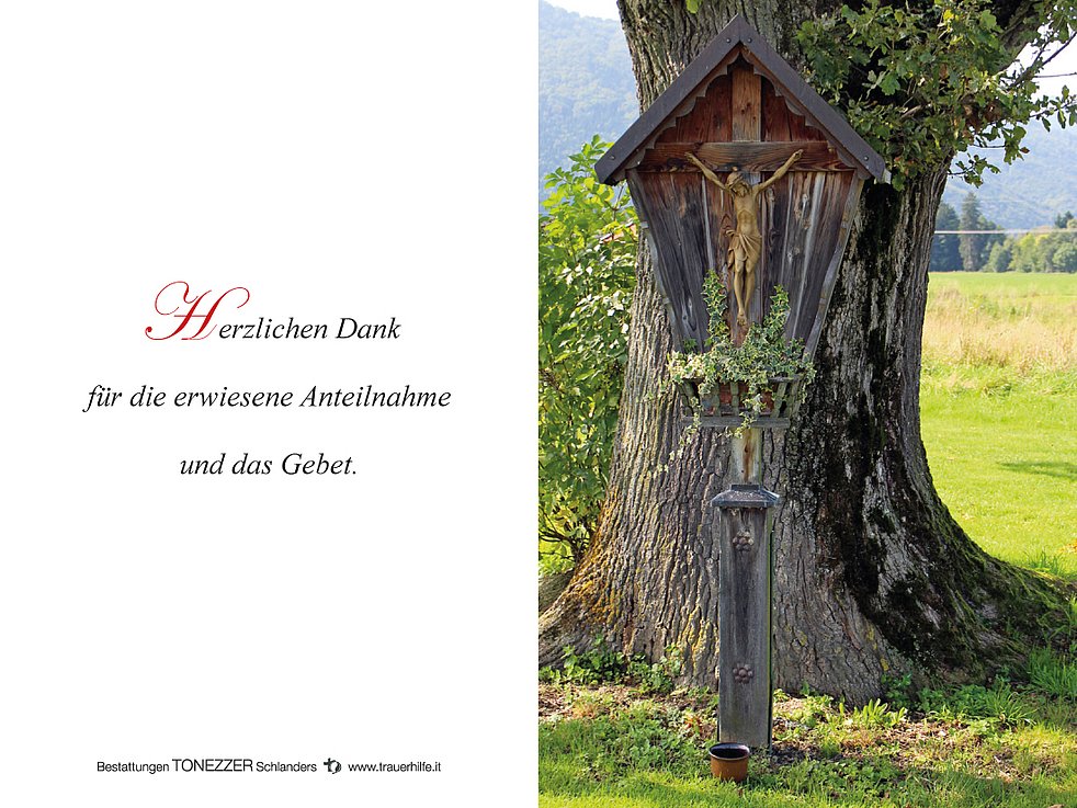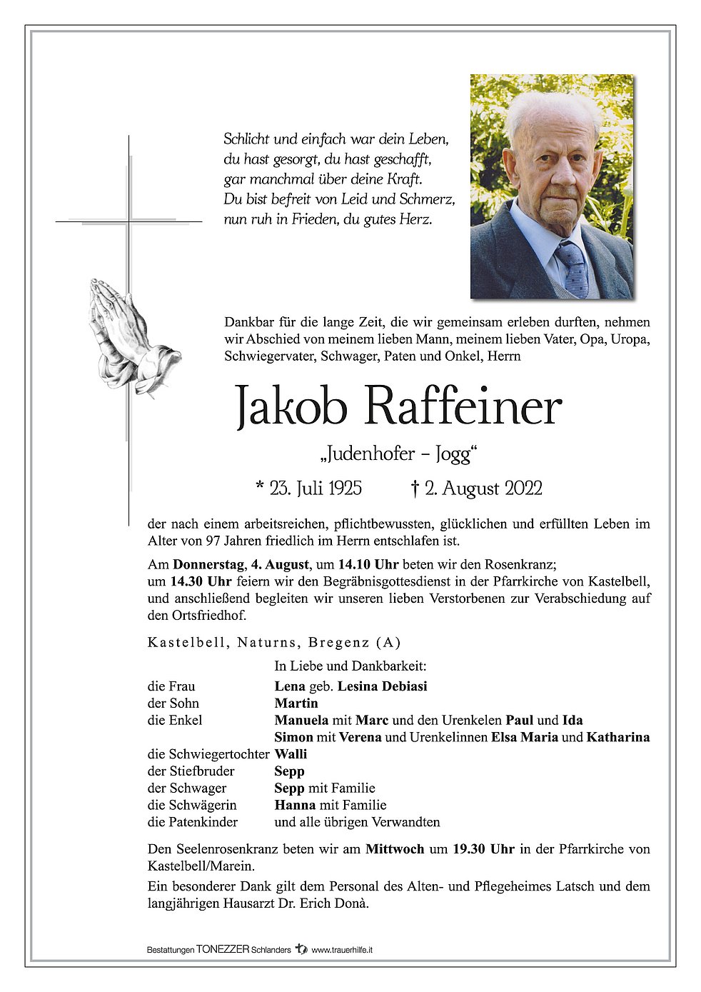 Am Donnerstag, 4. August, um 14.10 Uhr beten wir den Rosenkranz; um 14.30 Uhr feiern wir den Begräbnisgottesdienst in der Pfarrkirche von Kastelbell, und anschließend begleiten wir unseren lieben Verstorbenen zur Verabschiedung auf den Ortsfriedhof.