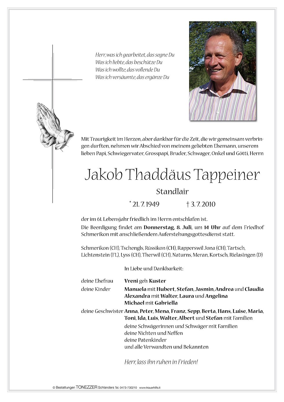 deine Geschwister Anna, Peter, Mena, Franz, Sepp, Berta, Hans, Luise, Maria, Toni, Ida, Luis, Walter, Albert und Stefan mit Familien
