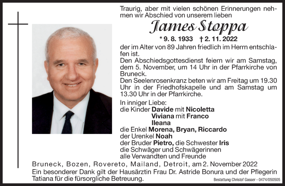 I funerali avranno luogo sabato 5 novembre alle ore 14.00 presso la Chiesa Parrocchiale di Brunico.