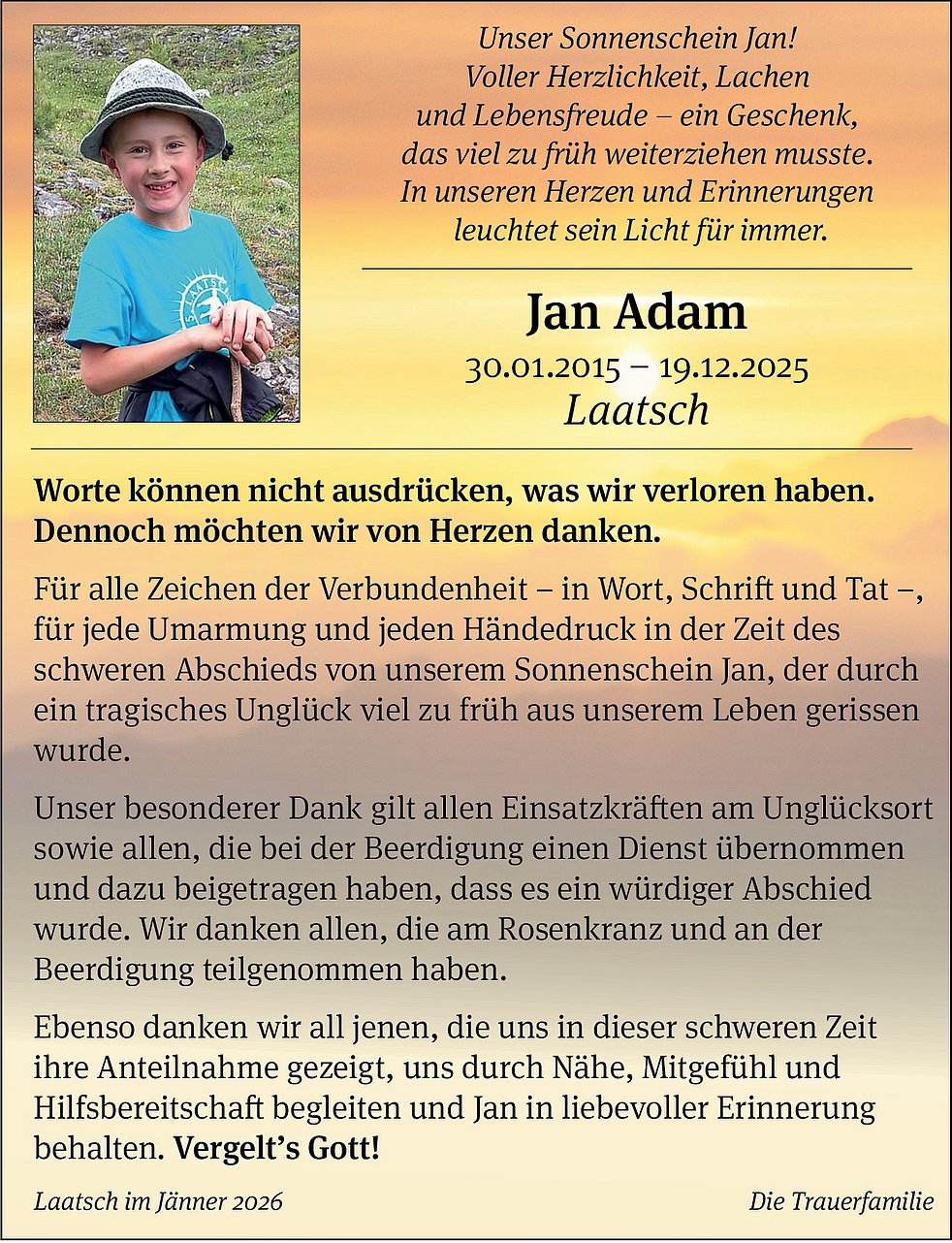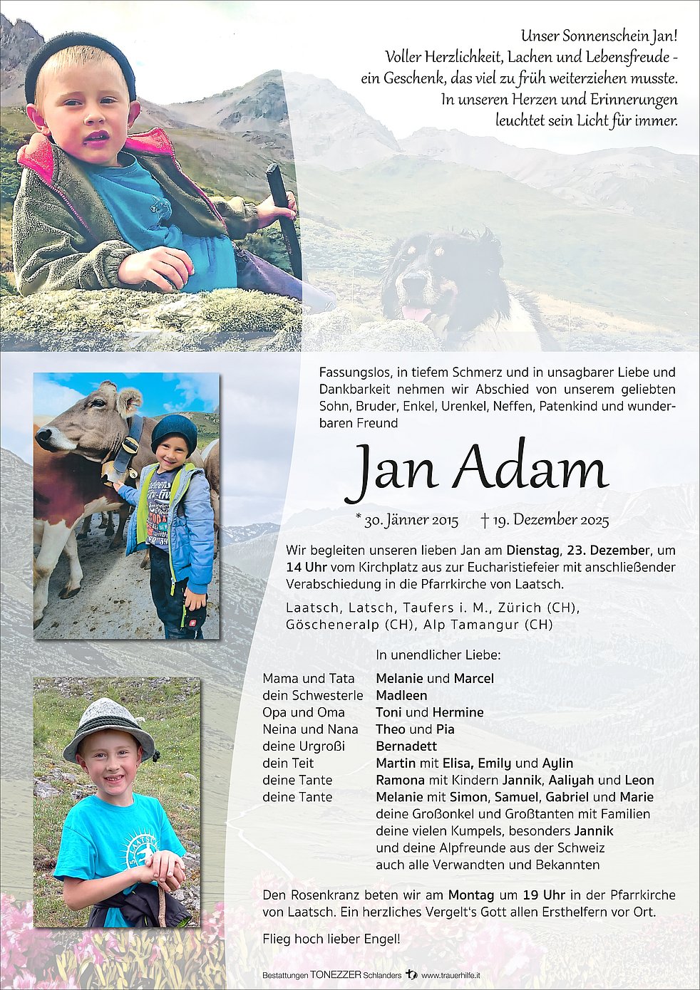 Wir begleiten unseren lieben Jan am Dienstag, 23. Dezember, um 14 Uhr vom Kirchplatz aus zur Eucharistiefeier mit anschließender Verabschiedung in die Pfarrkirche von Laatsch.