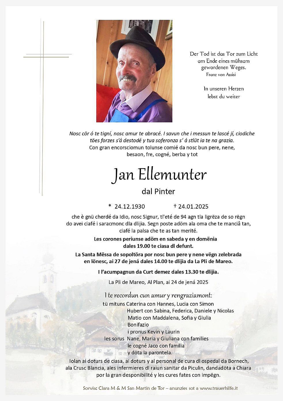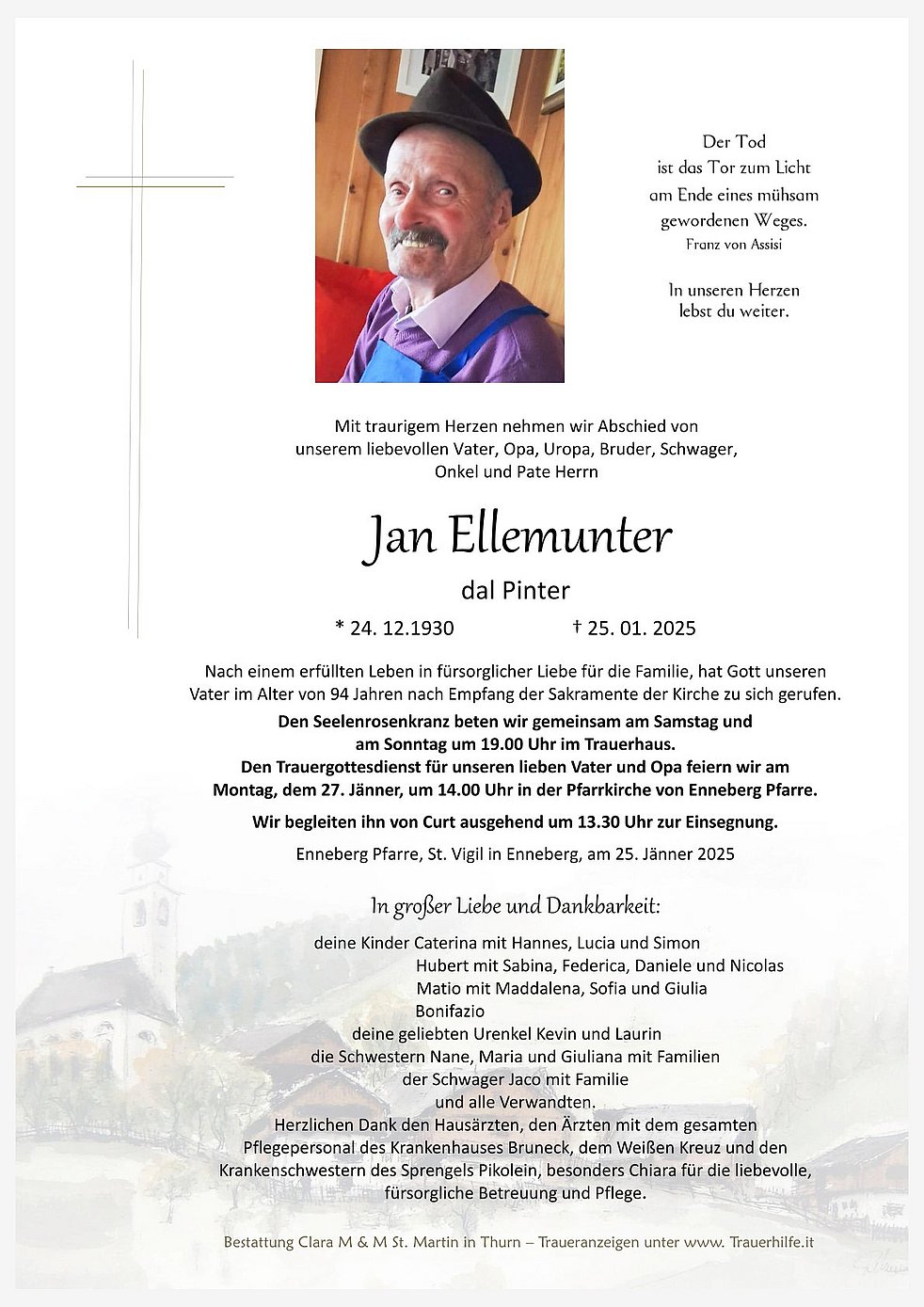 Begräbnisgottesdienst: 27.01. - 14:00 Uhr Enneberg Pfarre