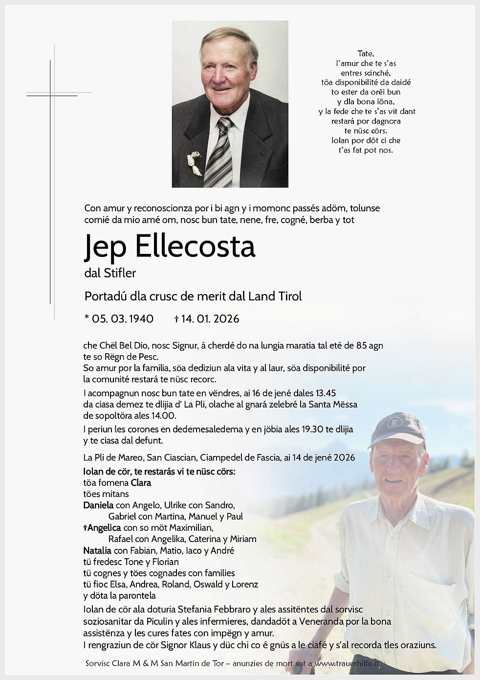 Aroeder Jep. Palsa saurì. Iolan de töa bona löna. Condolianzes a döta la familia