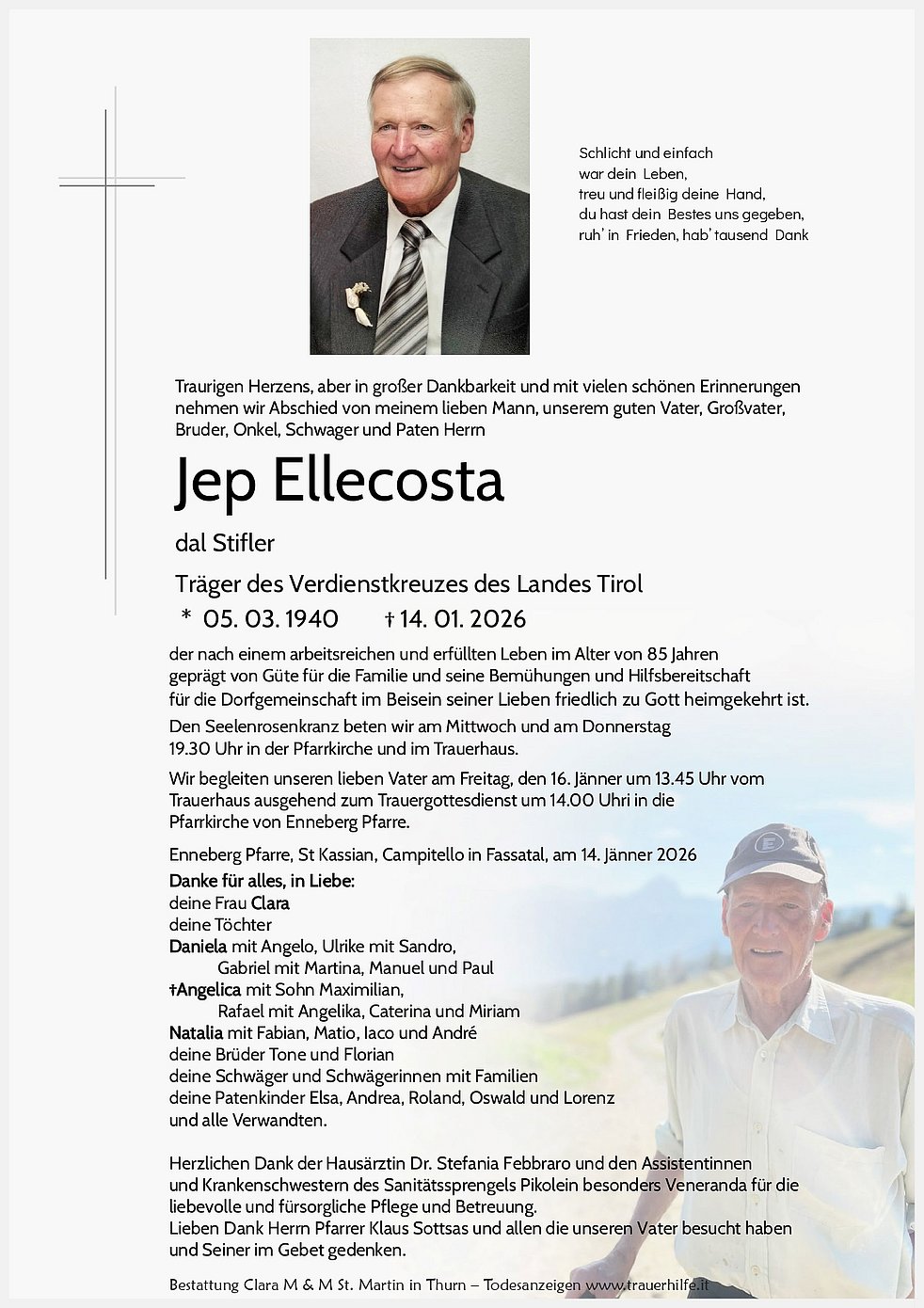 Begräbnisgottesdienst: 16.01. - 14:00 Uhr Enneberg Pfarre