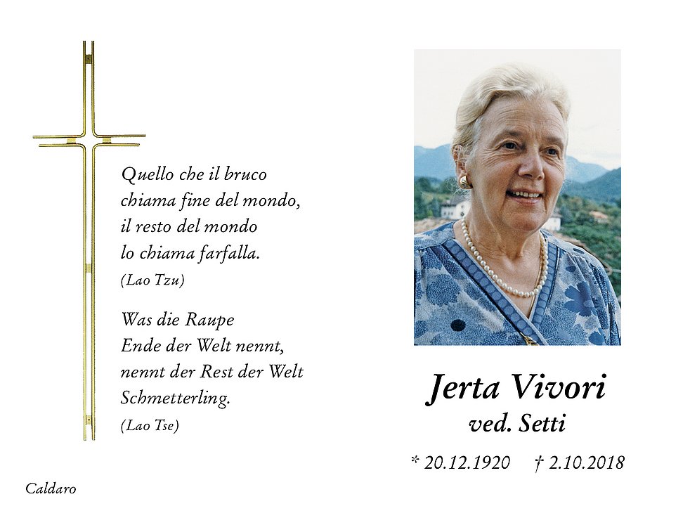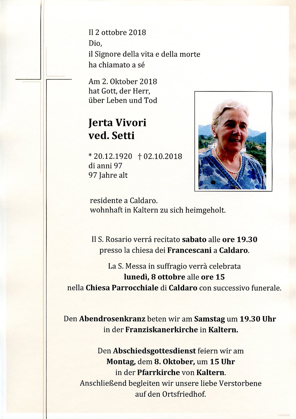 Den Abschiedsgottesdienst feiern wir am Montag, dem 8. Oktober um 15 Uhr in der Pfarrkirche von Kaltern. Anschließend begleiten wir unsere liebe Verstorbene auf den Ortsfriedhof.
