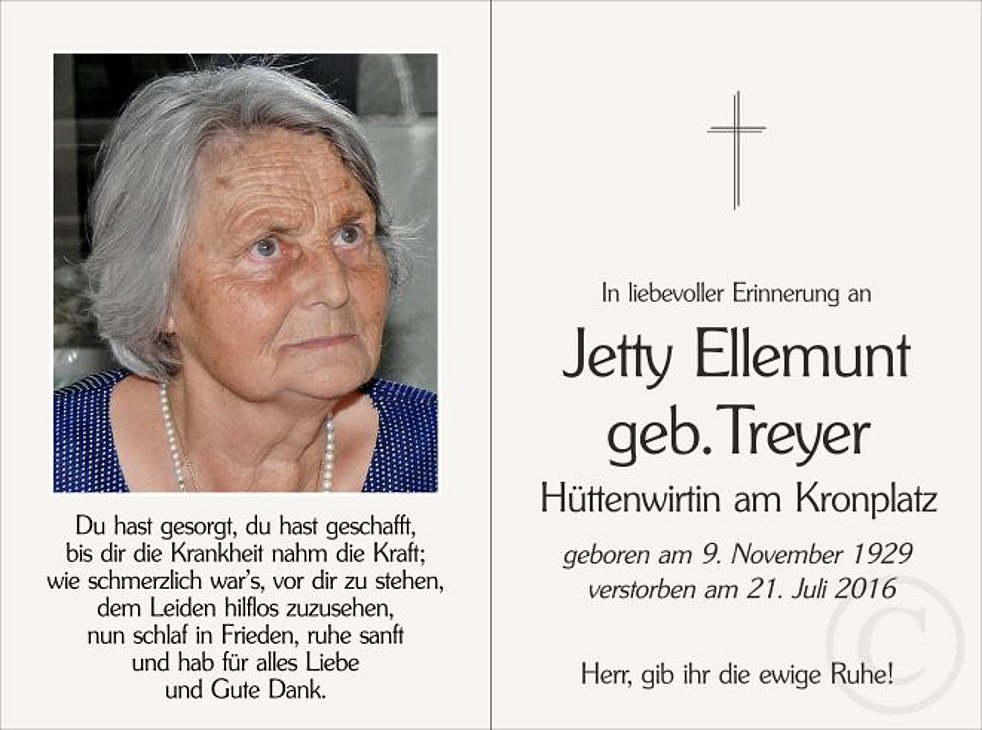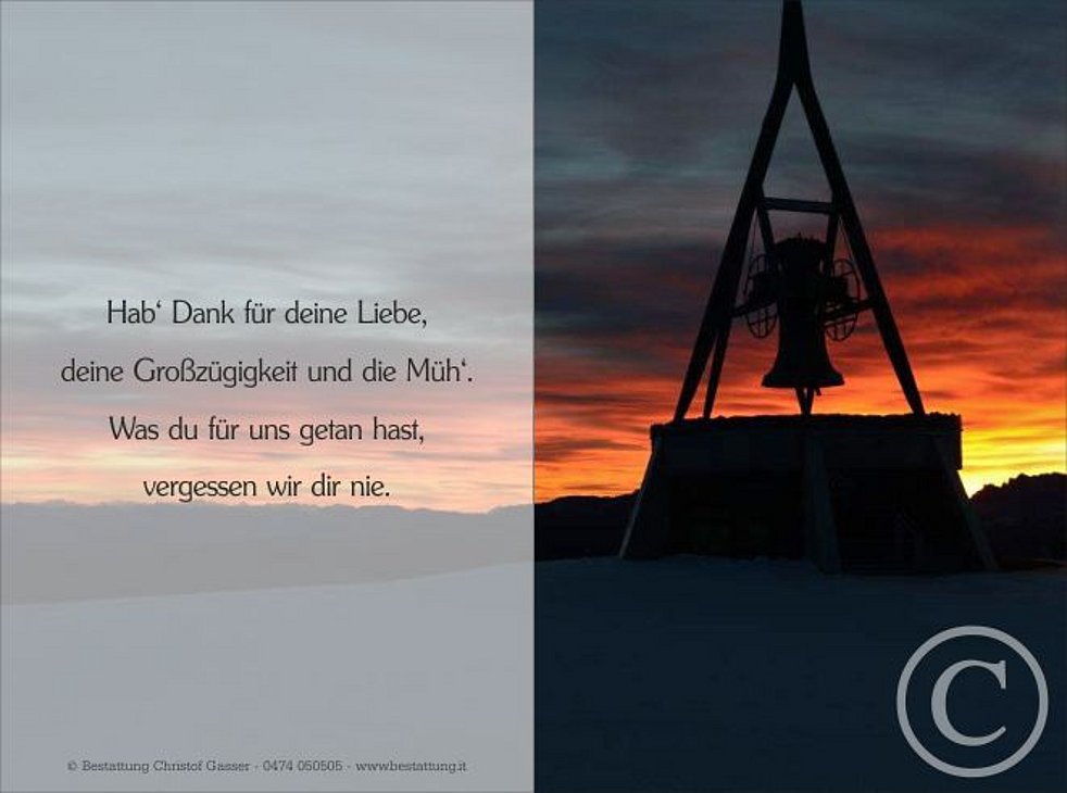 Der Abschiedsgottesdienst findet am Montag, dem 25. Juli, um 16 Uhr in der Pfarrkirche von Bruneck statt. Anschließend begleiten wir unsere liebe Mama zur letzten Ruhe in den Friedhof.