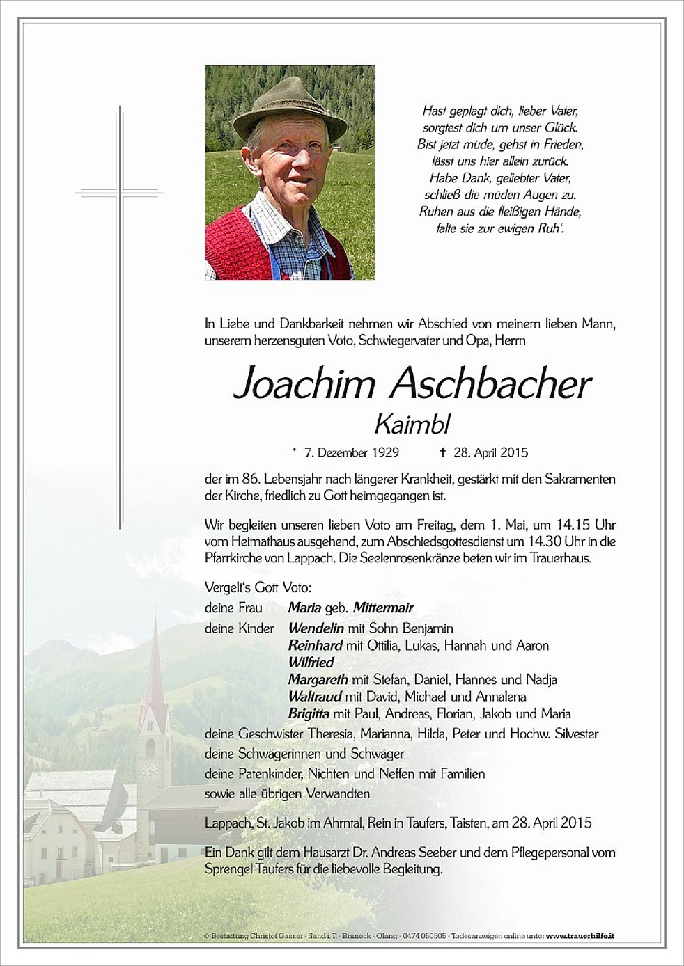 Wir begleiten unseren lieben Voto am Freitag, dem 1. Mai, um 14.15 Uhr vom Heimathaus ausgehend, zum Abschiedsgottesdienst um 14.30 Uhr in die Pfarrkirche von Lappach. Die Seelenrosenkränze beten wir im Trauerhaus.