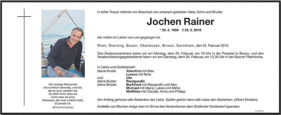 Den Trauergottesdienst mit anschlieβender Einsegnung feiern wir am Dienstag, den 26. Februar, um 13.30 Uhr im Dom von Bozen.