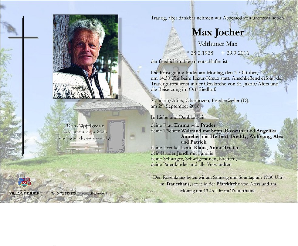 um 14.30 Uhr beim Lazur-Kreuz statt. Anschließend erfolgt der Trauergottesdienst in der Ortskirche von St. Jakob/Afers und die Beisetzung im Ortsfriedhof.
