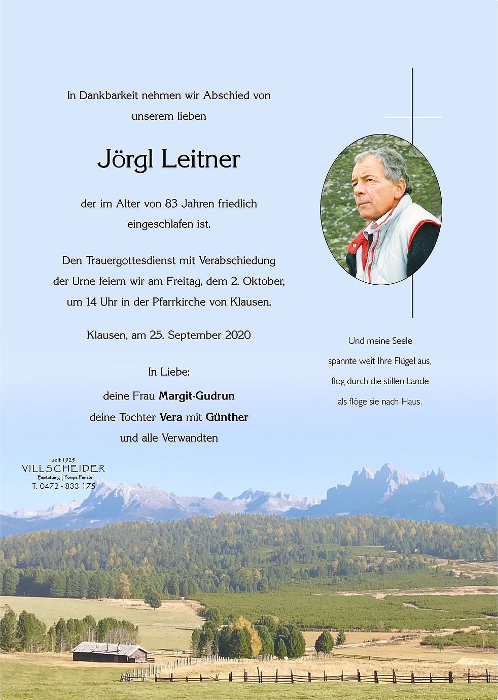 Liebe Margit u.Tochter, ich möchte euch zum Verlust von Jörgl von Herzen mein tiefstes Mitgefühl aussprechen. In lieber Erinnerung an unsere Kinder und Jugendzeit bin ich in Gedanken bei euch in Klausen.Viel Kraft für die schwere Zeit und liebe Menschen die euch in eurer Trauer beistehen wünscht euch von Herzen Sylvia Geissler(Lehmann)