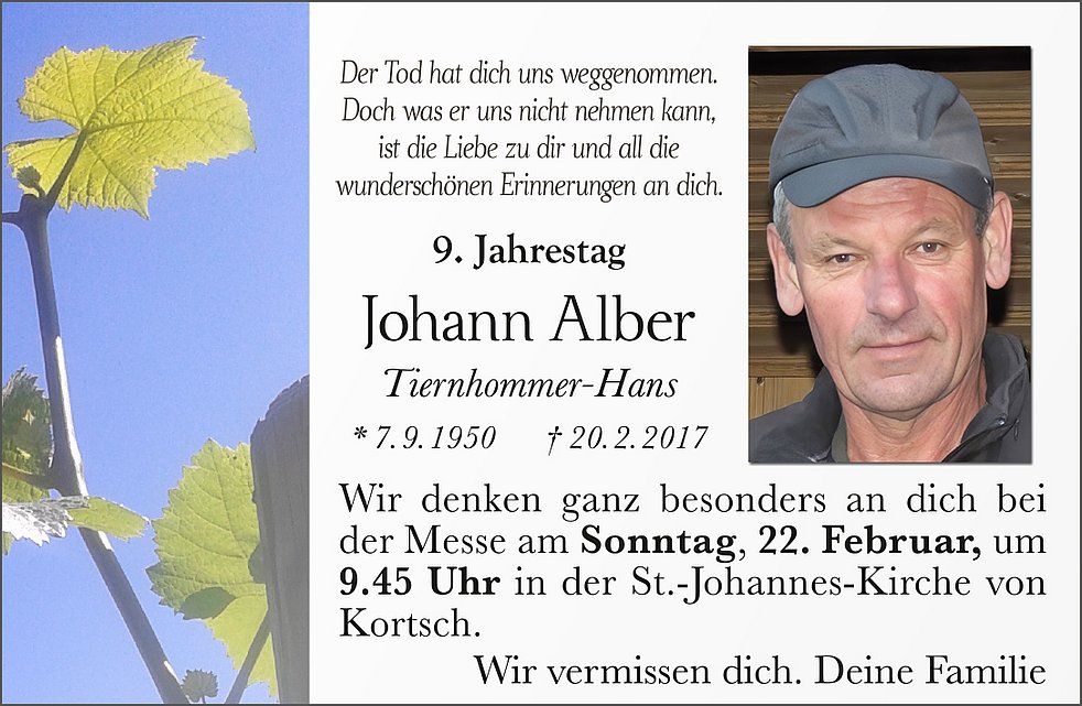 Wir begleiten unseren lieben Hans am Freitag, 24. Februar, um 14 Uhr vom Trauerhaus (Herrengasse 10) aus zum Begräbnisgottesdienst in die St.-Johannes-Kirche und anschließend zur Verabschiedung auf den Ortsfriedhof von Kortsch.