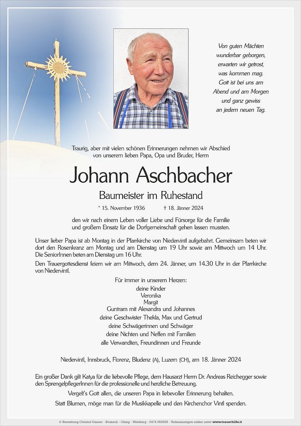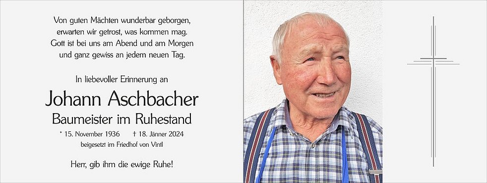 Den Trauergottesdienst feiern wir am Mittwoch, dem 24. Jänner, um 14.30 Uhr in der Pfarrkirche von Niedervintl.