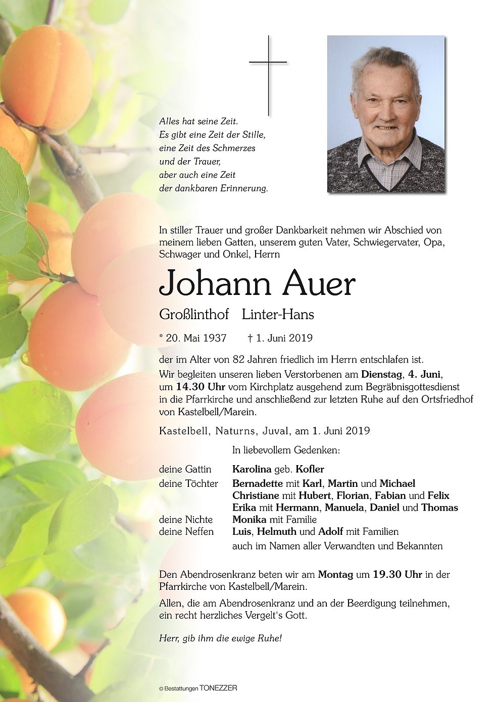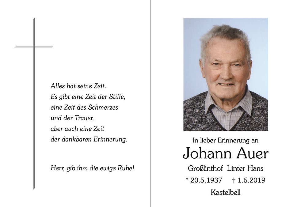 Wir begleiten unseren lieben Verstorbenen am Dienstag, 4. Juni, um 14.30 Uhr vom Kirchplatz ausgehend zum Begräbnisgottesdienst in die Pfarrkirche und anschließend zur letzten Ruhe auf den Ortsfriedhof von Kastelbell/Marein.