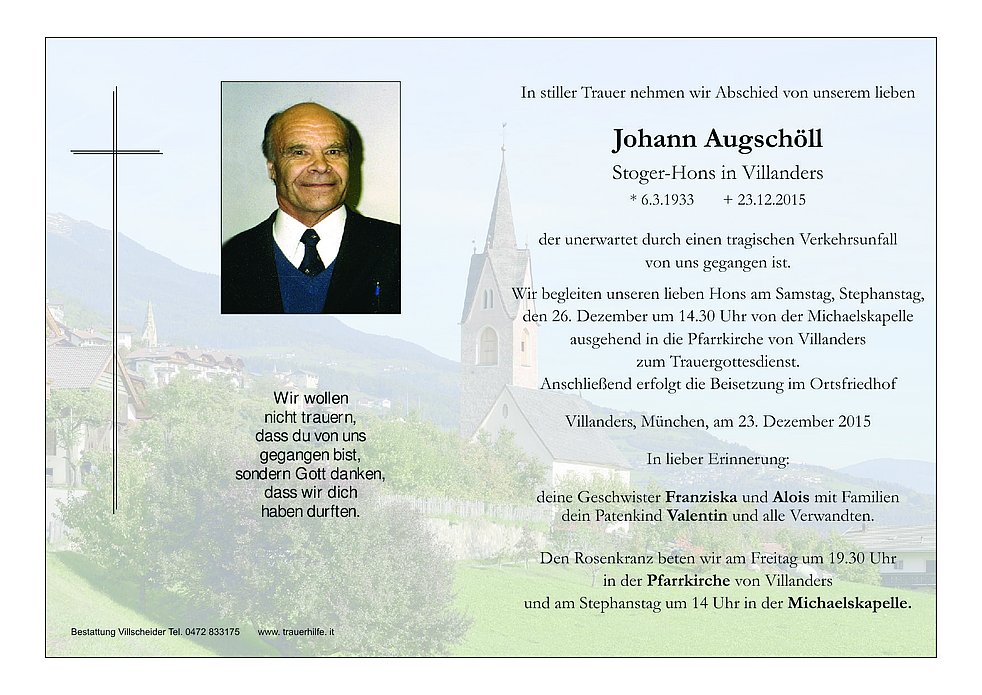 den 26. Dezember um 14.30 Uhr von der Michaelskapelle ausgehend in die Pfarrkirche von Villanders