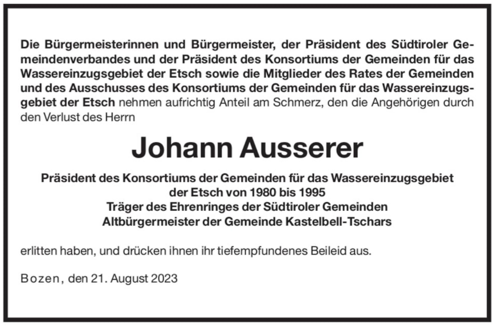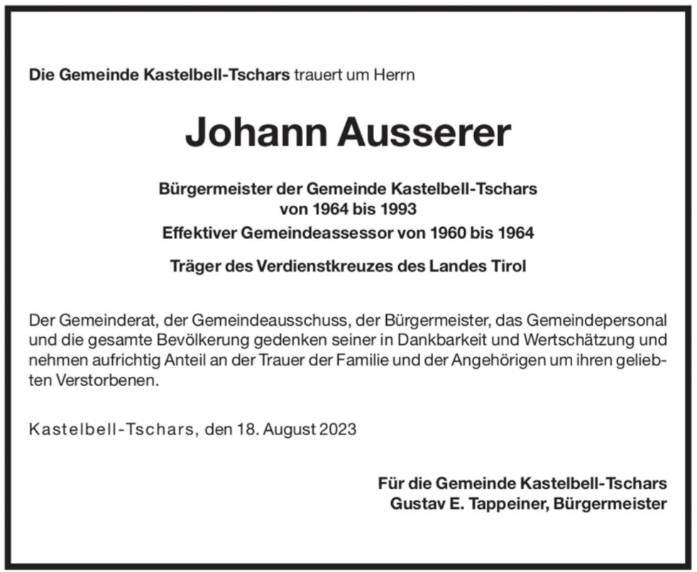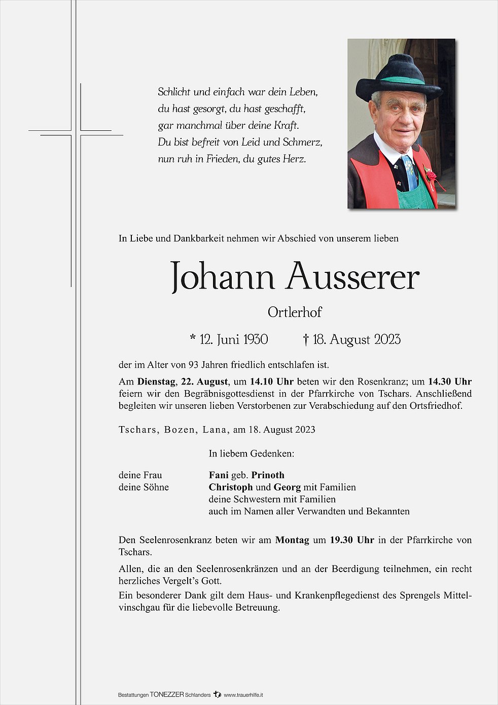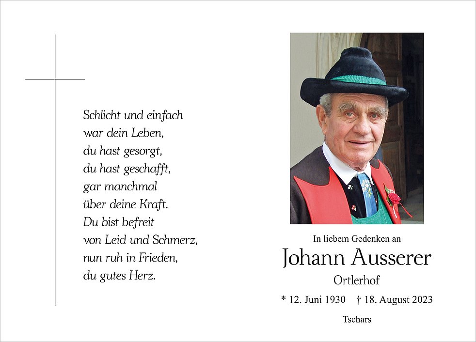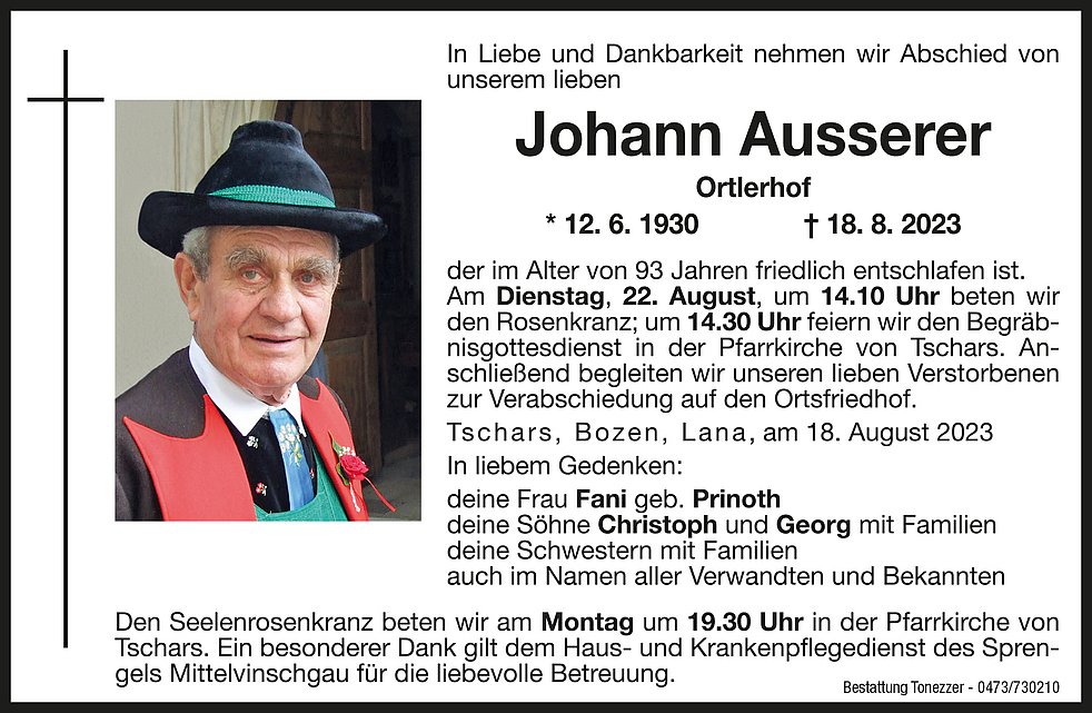Begräbnisgottesdienst: 22.08. - 14:30 Uhr Pfarrkirche Tschars
