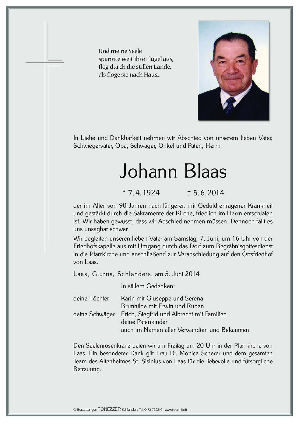 Wir begleiten unseren lieben Vater am Samstag, 7. Juni, um 16 Uhr von der Friedhofskapelle aus mit Umgang durch das Dorf zum Begräbnisgottesdienst in die Pfarrkirche und anschließend zur Verabschiedung auf den Ortsfriedhof von Laas.
