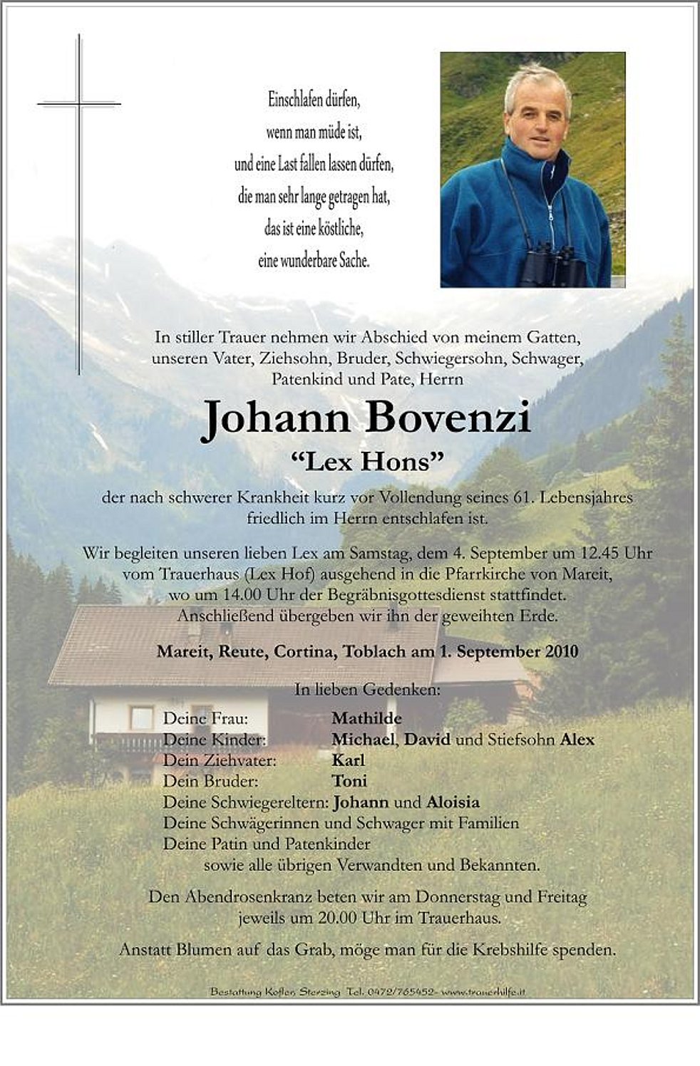 vom Trauerhaus (Lex Hof) ausgehend in die Pfarrkirche von Mareit, wo um 14.00 Uhr der Begräbnisgottesdienst stattfindet. Anschließend übergeben wir ihn der geweihten Erde.
