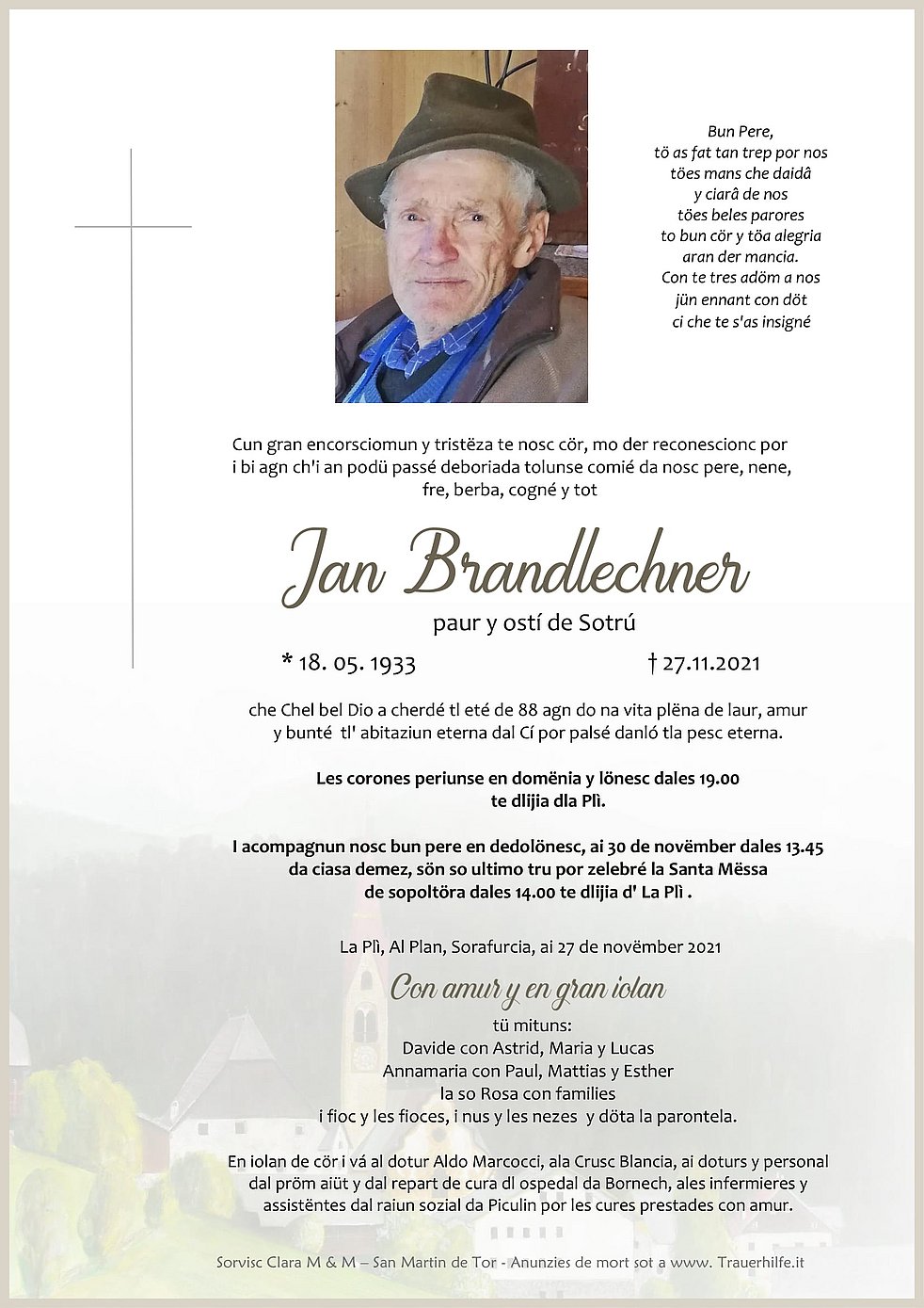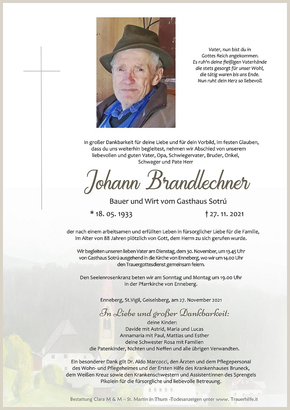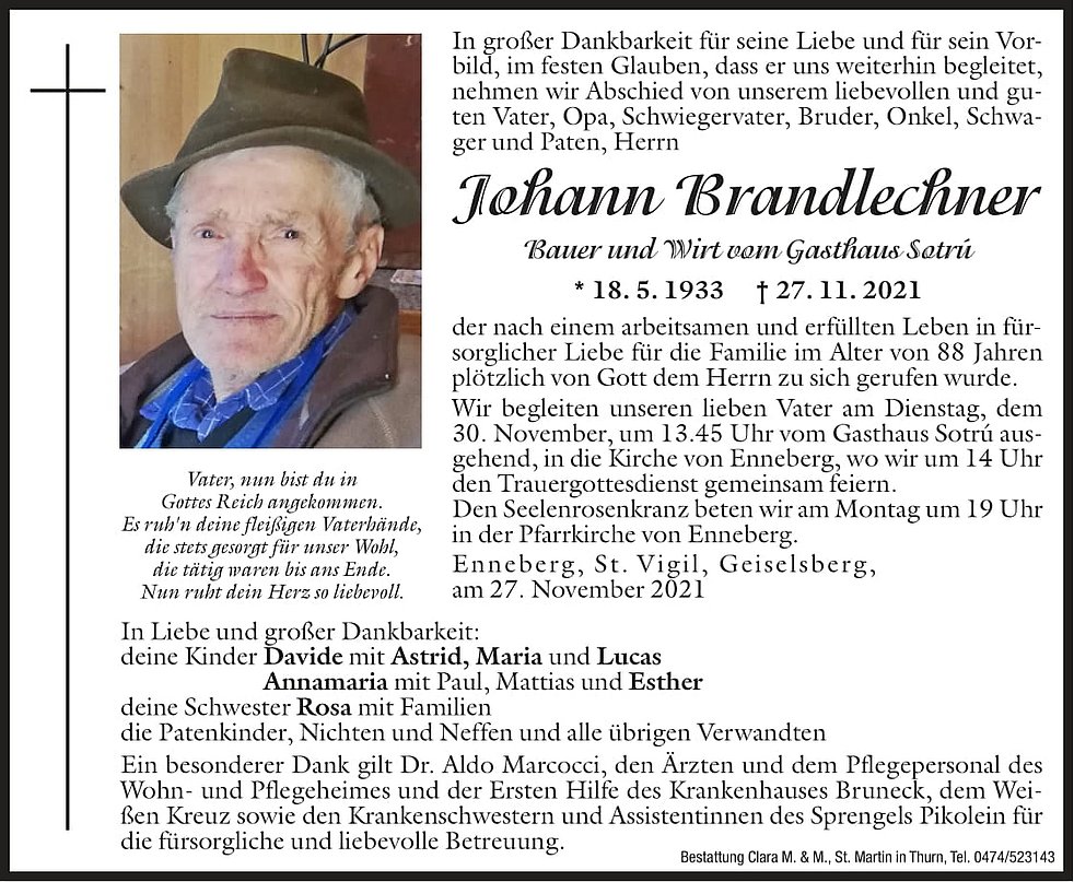 Wir begleiten unseren lieben Vater am Dienstag, dem 30. November, um 13.45 Uhr von Gasthaus Sotrú ausgehend in die Kirche von Enneberg, wo wir um 14.00 Uhr den Trauergottesdienst gemeinsam feiern.