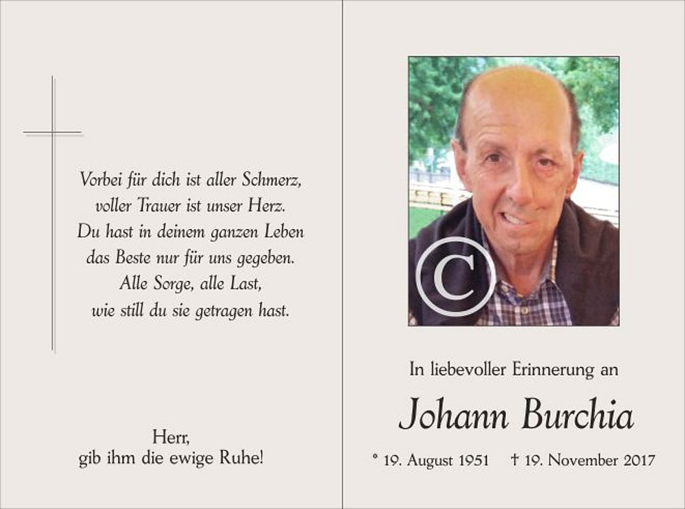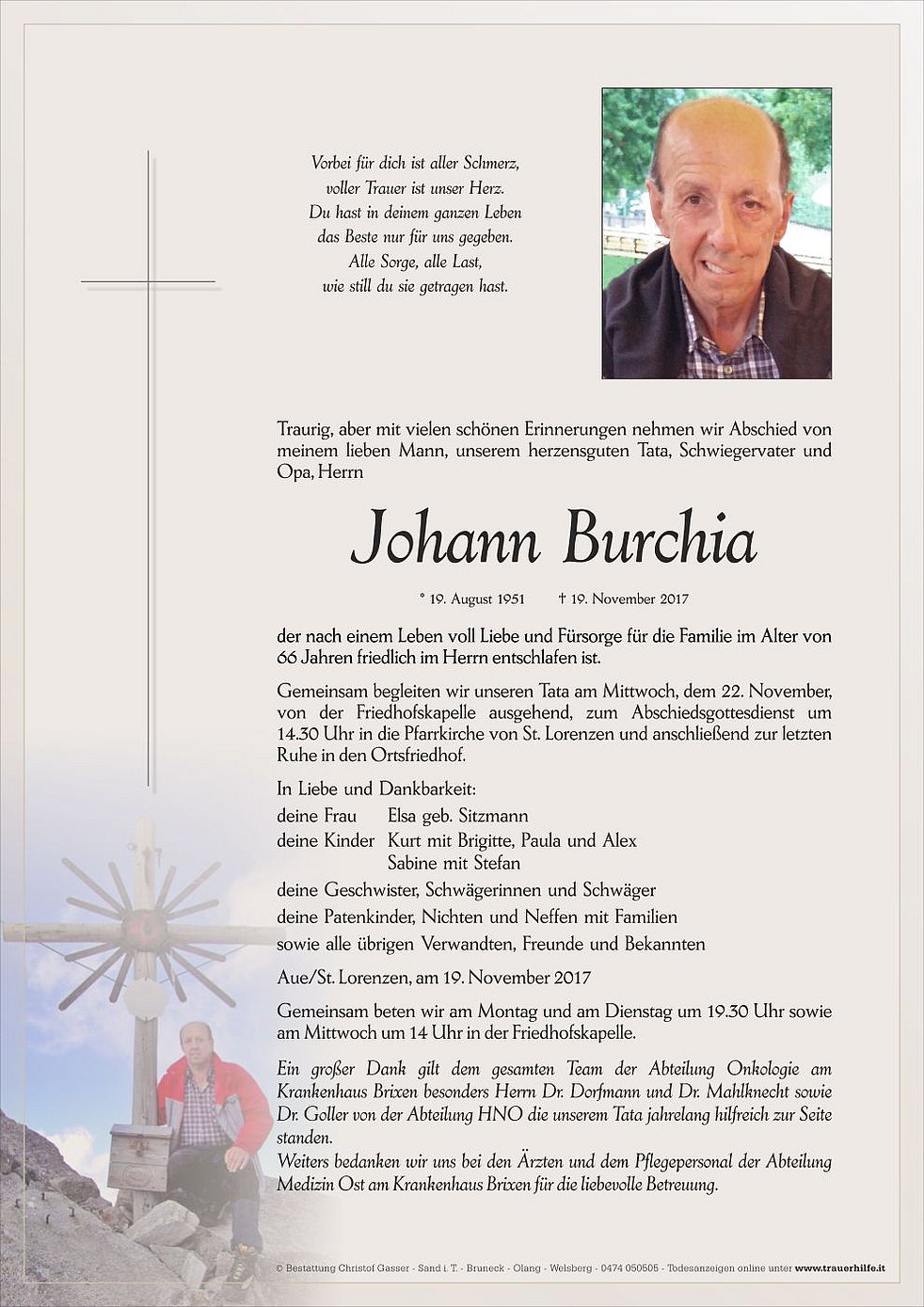 Gemeinsam begleiten wir unseren Tata am Mittwoch, dem 22. November, von der Friedhofskapelle ausgehend, zum Abschiedsgottesdienst um 14.30 Uhr in die Pfarrkirche von St. Lorenzen und anschließend zur letzten Ruhe in den Ortsfriedhof.