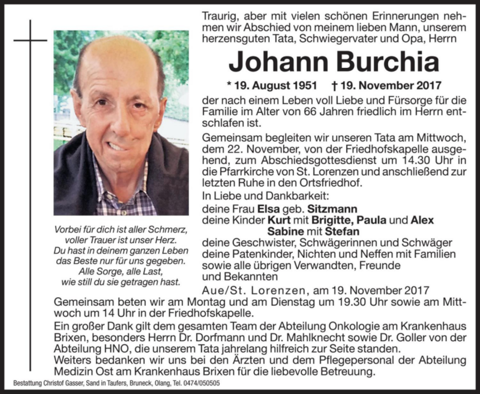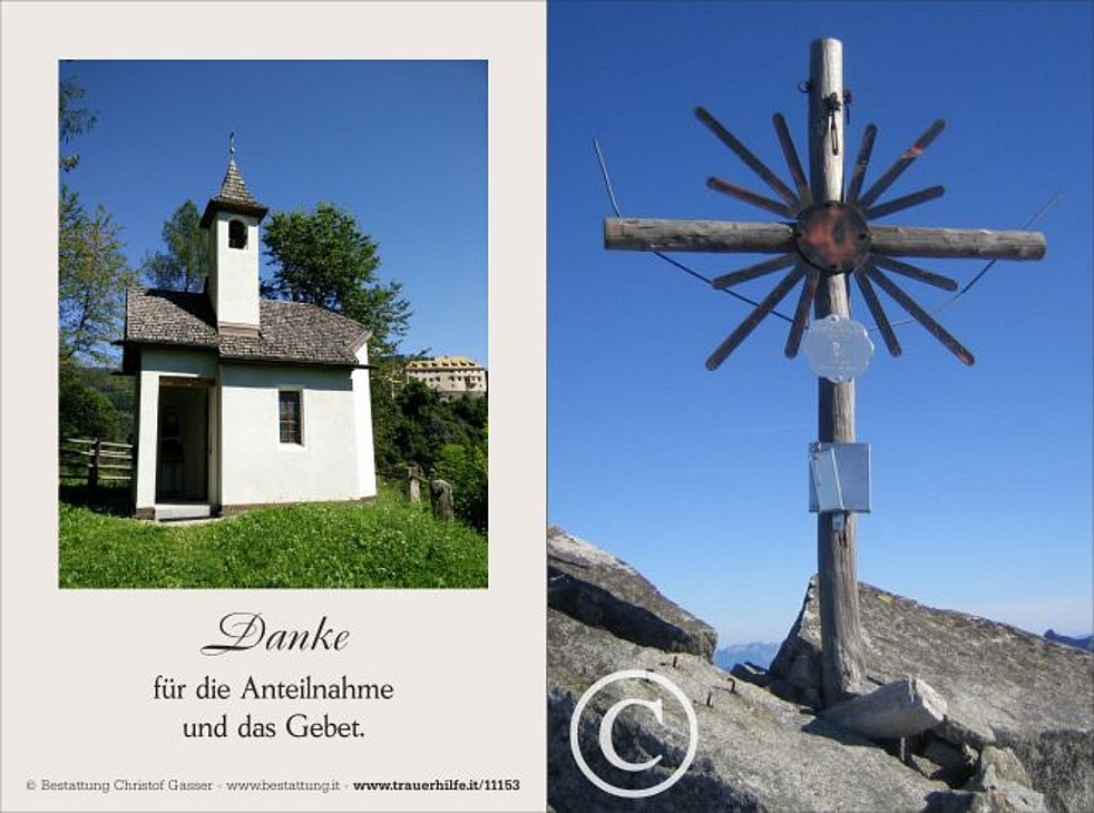 Ein großer Dank gilt dem gesamten Team der Abteilung Onkologie am Krankenhaus Brixen besonders Herrn Dr. Dorfmann und Dr. Mahlknecht sowie Dr. Goller von der Abteilung HNO die unserem Tata jahrelang hilfreich zur Seite standen.