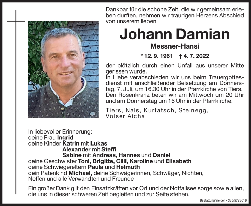 In Liebe verabschieden wir uns beim Trauergottesdienst mit anschließender Beisetzung am Donnerstag 7. Juli, um 16.30 Uhr in der Pfarrkirche von Tiers