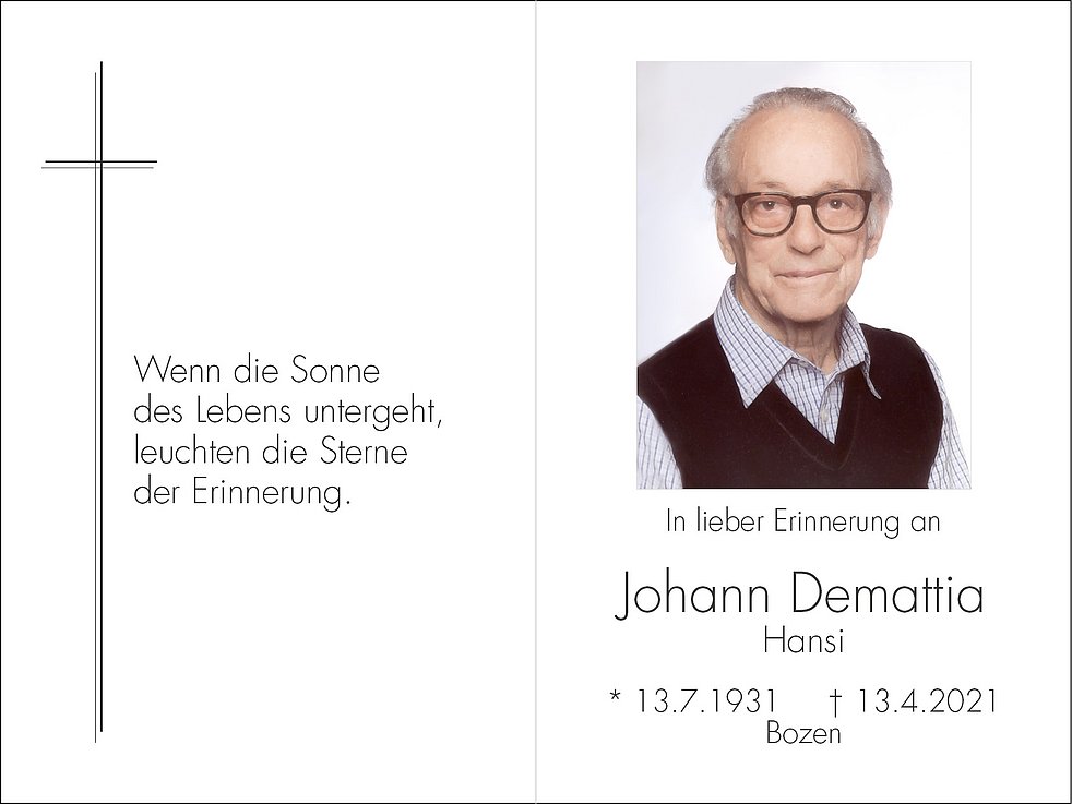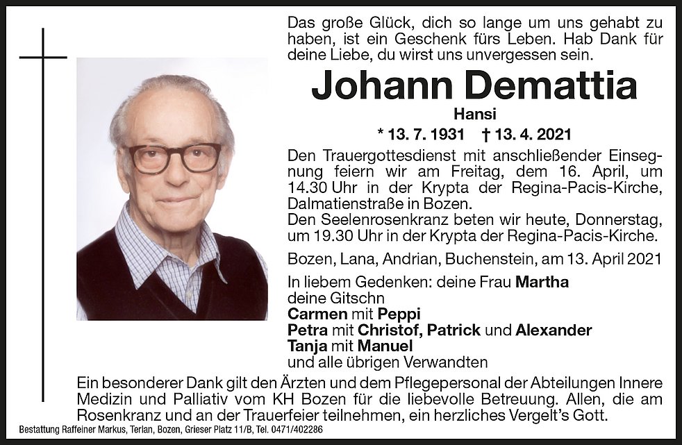 Den Trauergottesdienst mit anschlieβender Einsegnung feiern wir am Freitag, dem 16. April, um 14.30 Uhr in der Krypta der Regina-Pacis-Kirche, Dalmatienstrasse in Bozen.