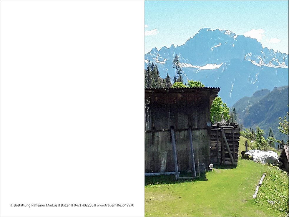 Ein besonderer Dank gilt den Ärzten und dem Pflegepersonal der Abteilungen Innere Medizin und Palliativ vom KH Bozen für die liebevolle Betreuung.