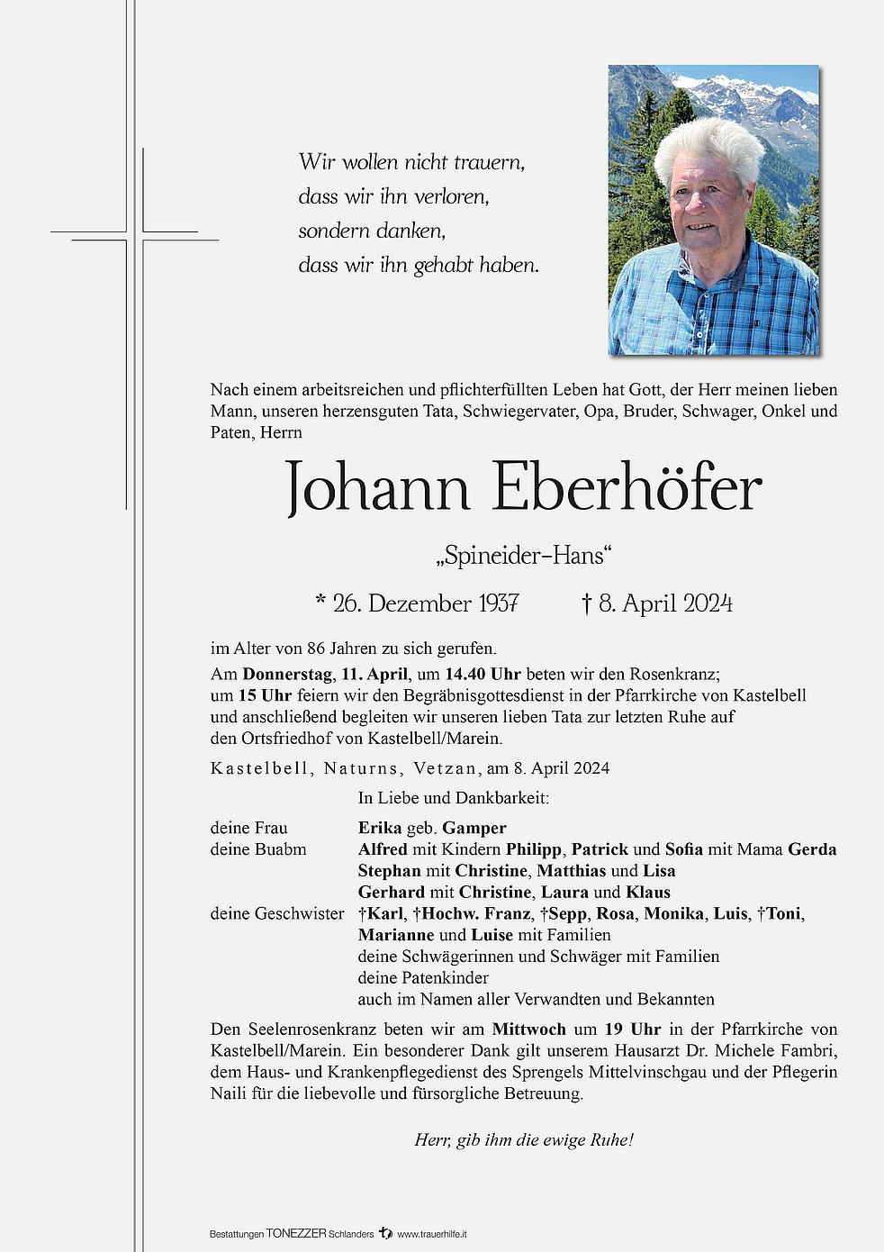 Der Verlust deines Vaters verändert dein Leben,egal wie alt du bist.Dein Vater ist dein Beschützer,dein Held.Du wirst nie wirklich über diesen Verlust hinwegkommen.Du wirst lernen damit zu leben und ihn für immer in deinem Herzen ❤ bewahren.Lieber Gerhard mit Familie ich drücke euch hiermit mein herzliches Beileid aus und wünsche euch viel Kraft in dieser schweren Zeit 🙏