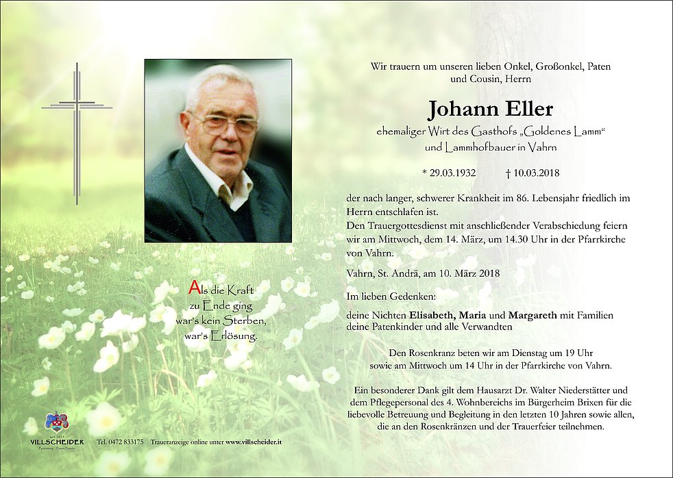 Den Trauergottesdienst mit anschließender Verabschiedung feiern wir am Mittwoch, dem 14. März, um 14.30 Uhr in der Pfarrkirche von Vahrn.