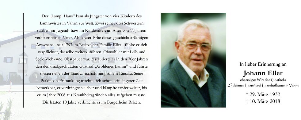 Ein besonderer Dank gilt dem Hausarzt Dr. Walter Niederstätter und dem Pflegepersonal des 4. Wohnbereichs im Bürgerheim Brixen für die liebevolle Betreuung und Begleitung in den letzten 10 Jahren sowie allen, die an den Rosenkränzen und der Trauerfeier teilnehmen.