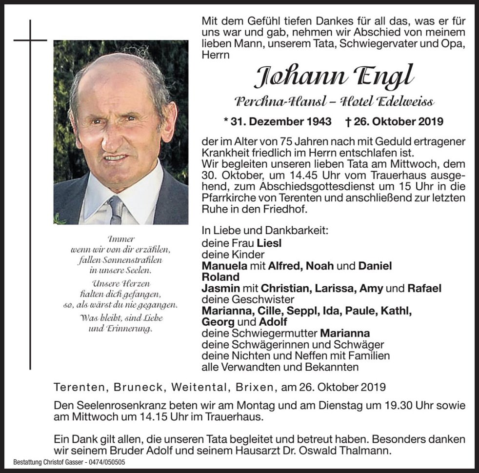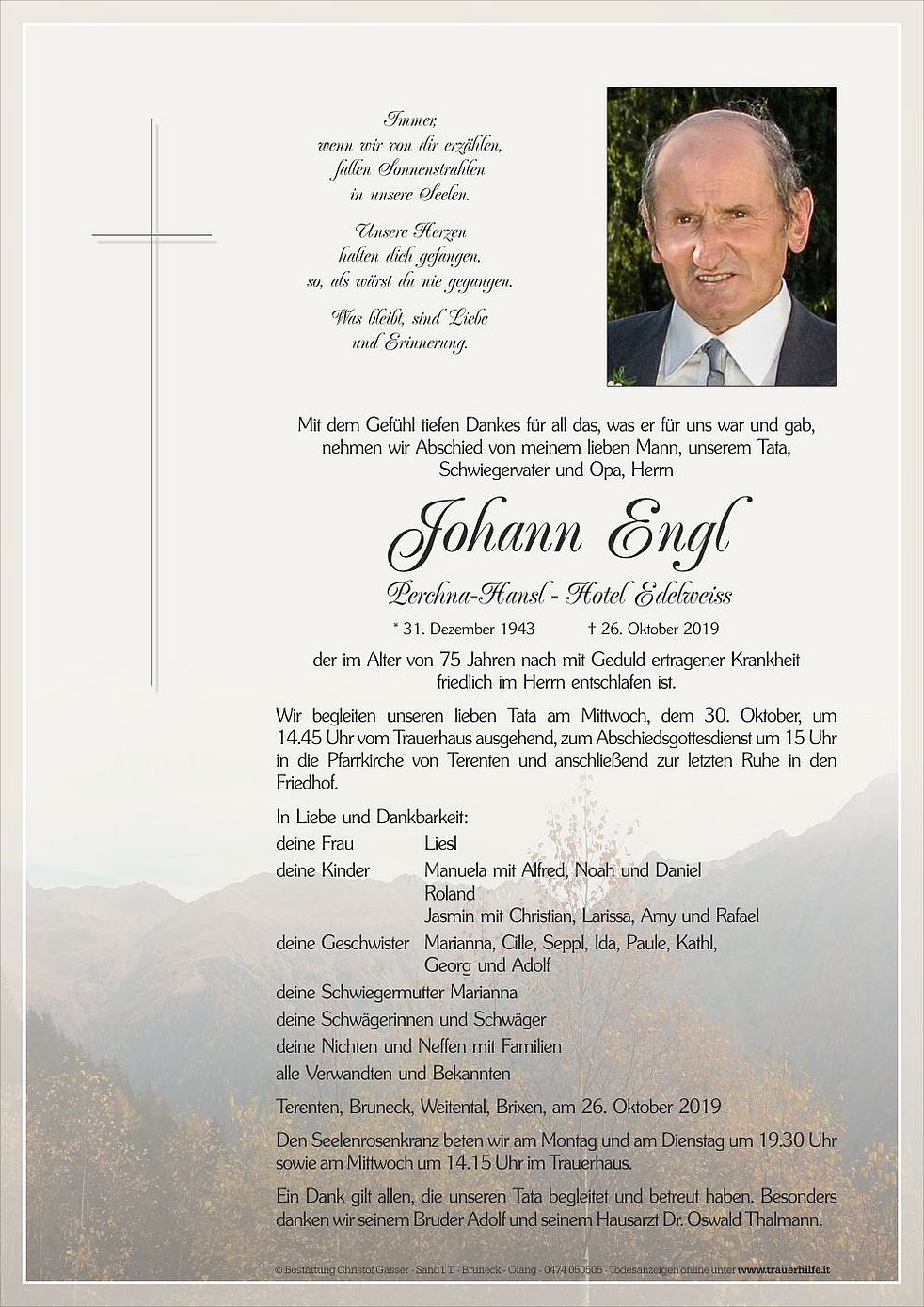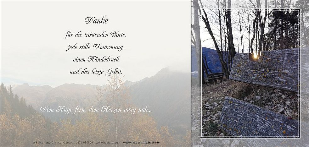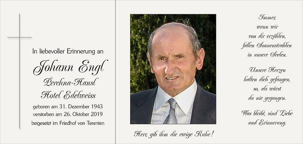 Wir begleiten unseren lieben Tata am Mittwoch, dem 30. Oktober, um 14.45 Uhr vom Trauerhaus ausgehend, zum Abschiedsgottesdienst um 15 Uhr in die Pfarrkirche von Terenten und anschließend zur letzten Ruhe in den Friedhof.