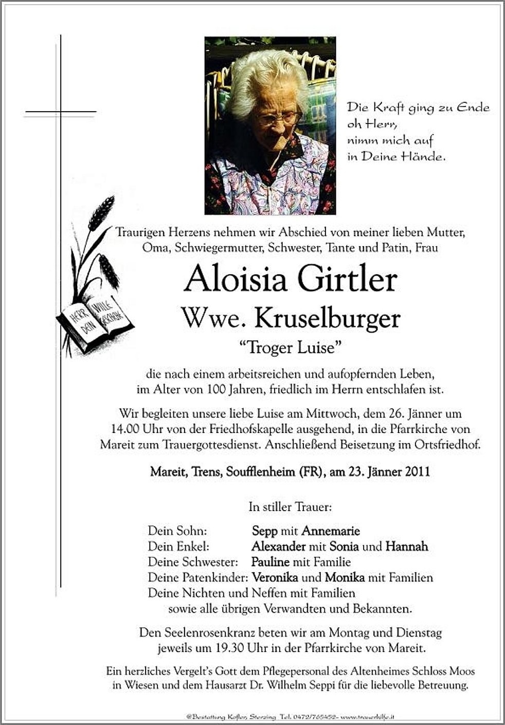 um 12.30 Uhr vom Trauerhaus ausgehend in die Pfarrkirche von Mareit,
