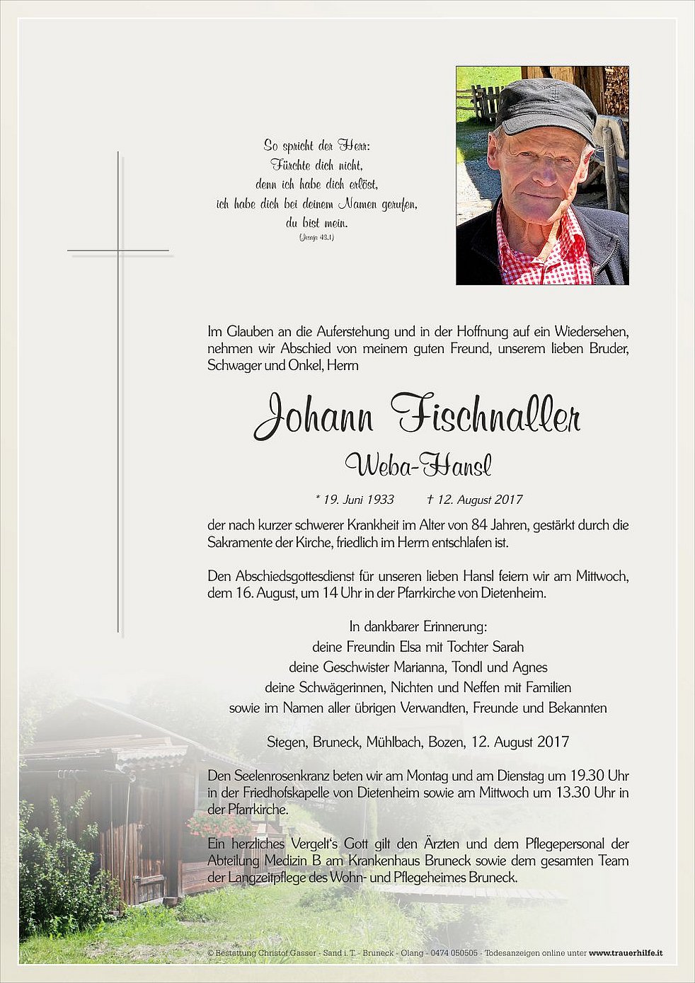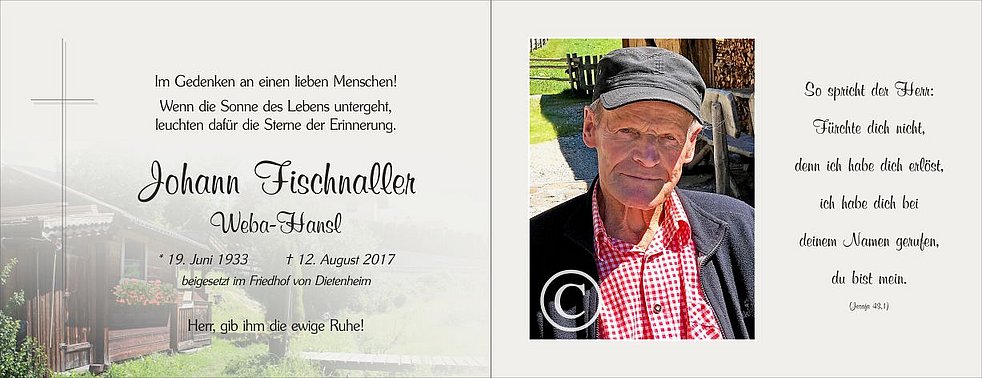 Den Abschiedsgottesdienst für unseren lieben Hansl feiern wir am Mittwoch, dem 16. August, um 14 Uhr in der Pfarrkirche von Dietenheim.