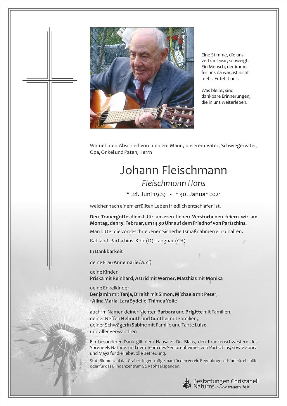 Den Trauergottesdienst für unseren lieben Verstorbenen feiern wir am Montag, den 15. Februar, um 14.30 Uhr auf dem Friedhof von Partschins.