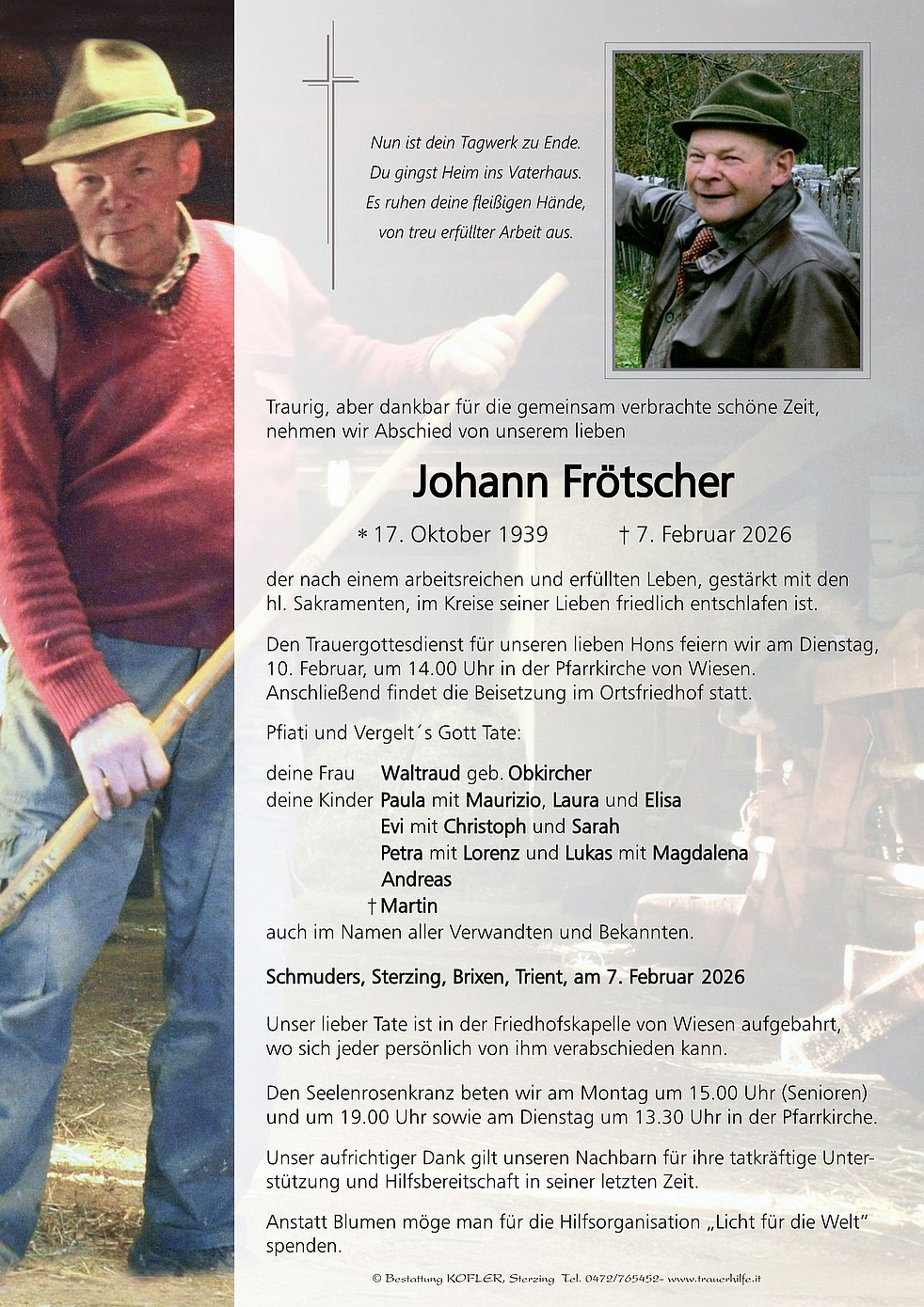 Den Trauergottesdienst für unseren lieben Hons feiern wir am Dienstag, 10. Februar, um 14.00 Uhr in der Pfarrkirche von Wiesen. Anschließend findet die Beisetzung im Ortsfriedhof statt.