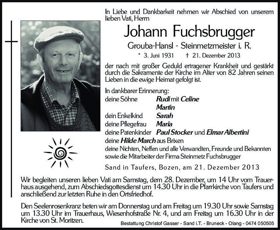 Wir begleiten unseren lieben Vati am Samstag, dem 28. Dezember, um 14 Uhr vom Trauer-haus ausgehend, zum Abschiedsgottesdienst um 14.30 Uhr in die Pfarrkirche von Taufers und anschließend zur letzten Ruhe in den Ortsfriedhof.
