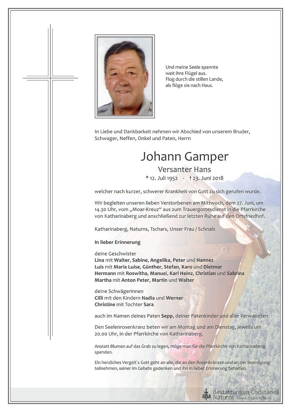 Wir begleiten unseren lieben Verstorbenen am Mittwoch, dem 27. Juni, um 14.30 Uhr, vom „Moar-Kreuz“ aus zum Trauergottesdienst in die Pfarrkirche von Katharinaberg und anschließend zur letzten Ruhe auf den Ortsfriedhof.