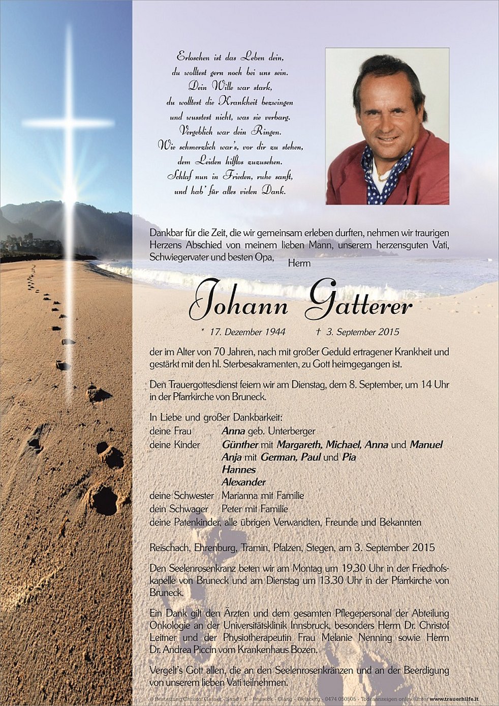 Den Trauergottesdienst feiern wir am Dienstag, dem 8. September, um 14 Uhr in der Pfarrkirche von Bruneck.
