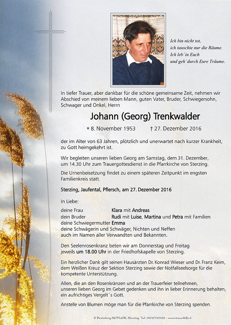 Wir begleiten unseren lieben Georg am Samstag, dem 31. Dezember, um 14.30 Uhr zum Trauergottesdienst in die Pfarrkirche von Sterzing.
