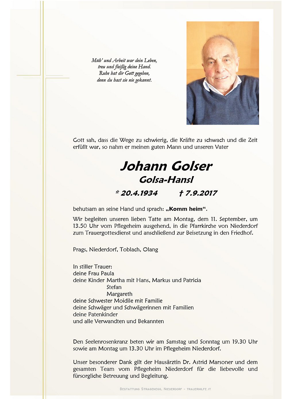 Wir begleiten unseren lieben Tatte am Montag, dem 11. September, um 13.50 Uhr vom Pflegeheim ausgehend, in die Pfarrkirche von Niederdorf zum Trauergottesdienst und anschließend zur Beisetzung in den Friedhof.