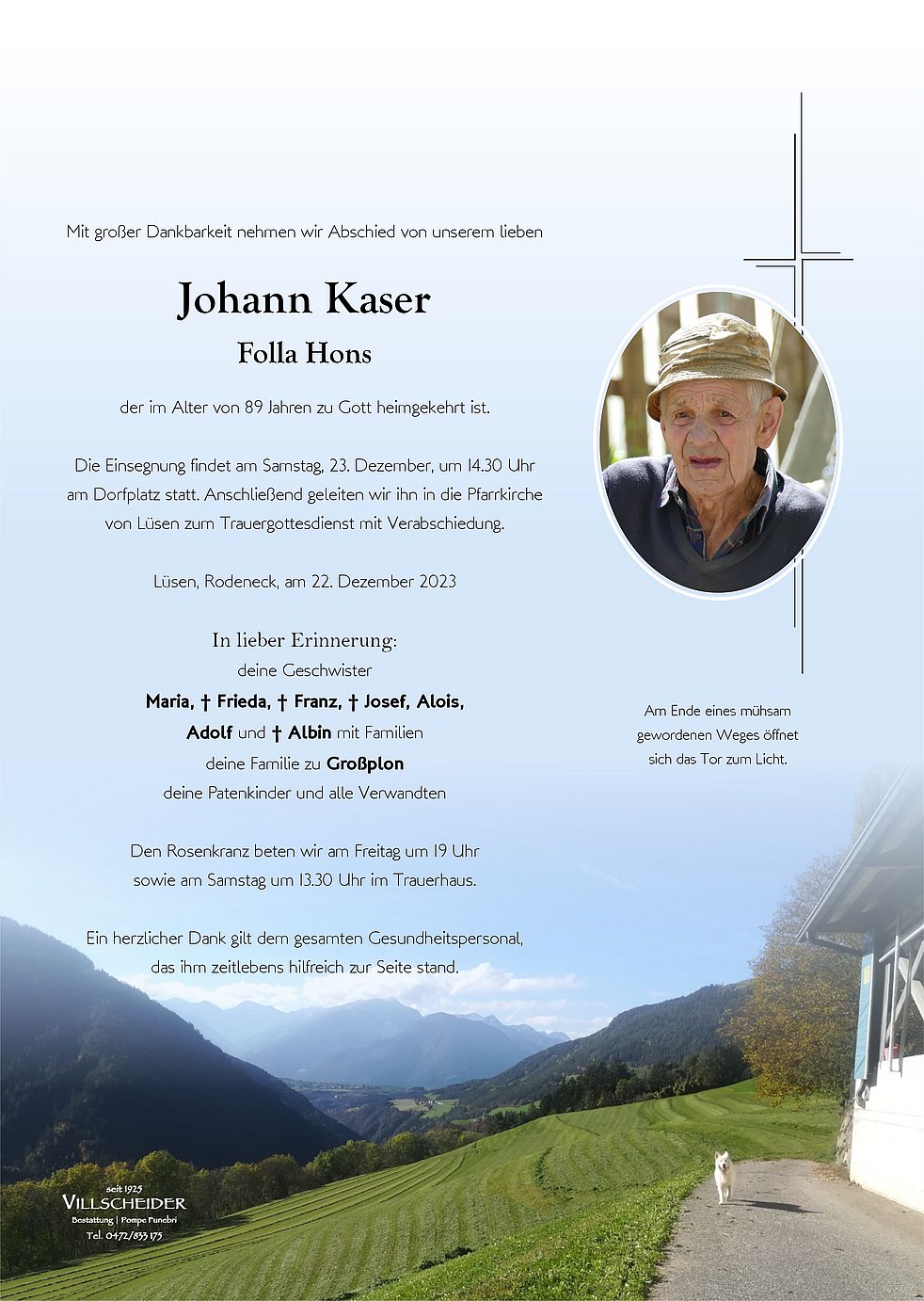 Begräbnisgottesdienst: 23.12. - 14:30 Uhr Lüsen