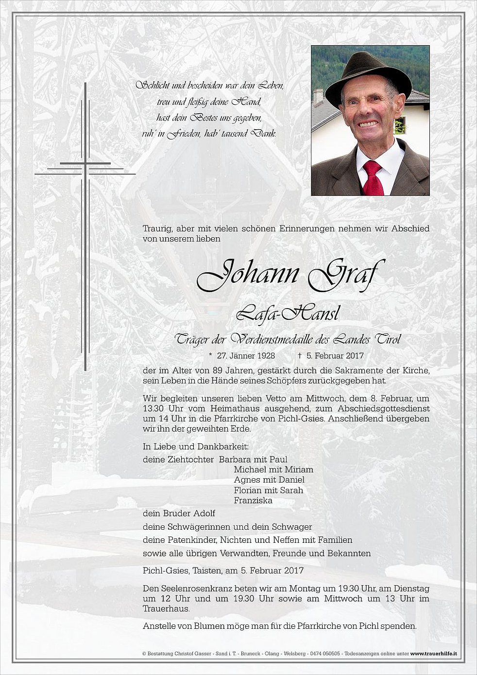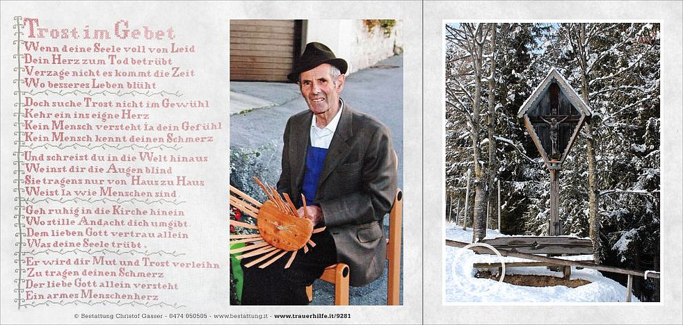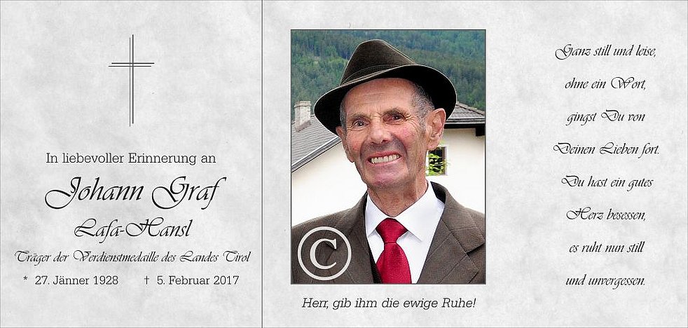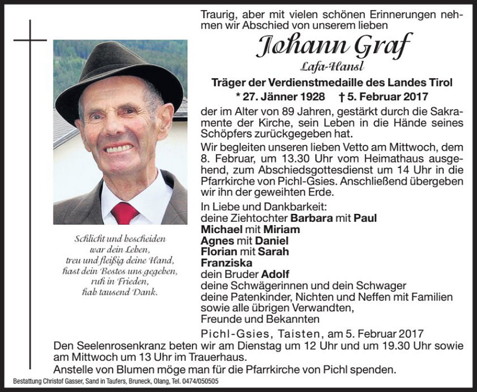 Wir begleiten unseren lieben Vetto am Mittwoch, dem 8. Februar, um 13.30 Uhr vom Heimathaus ausgehend, zum Abschiedsgottesdienst um 14 Uhr in die Pfarrkirche von Pichl-Gsies. Anschließend übergeben wir ihn der geweihten Erde.